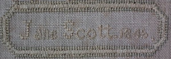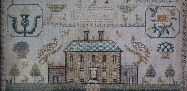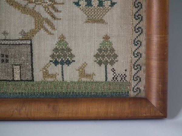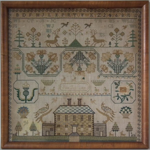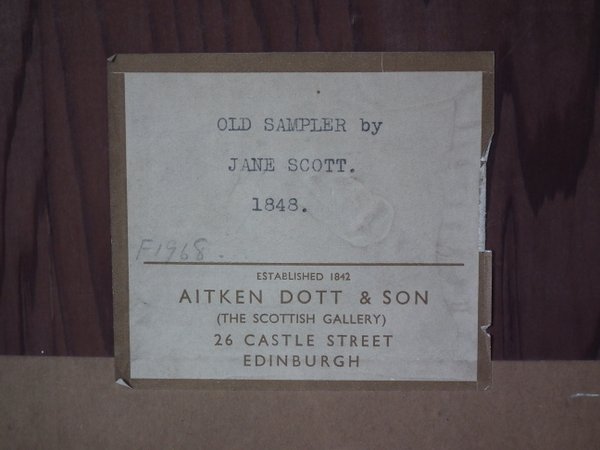 Victorian, dated 1845. 16.5ins high by 16.5ins wide. 1845 Scottish Sampler by Jane Scott. Framed in an old wood frame with rippled, old glass.