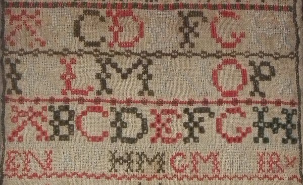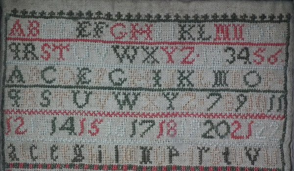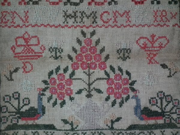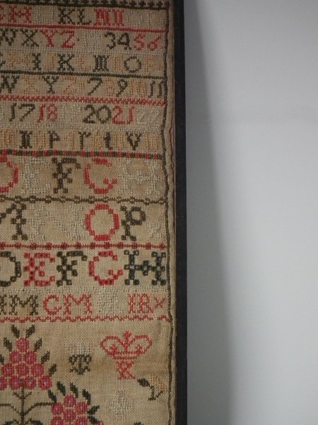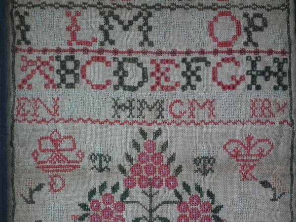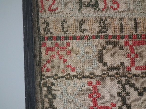 The sampler is worked in fine wool and cotton on canvas ground, in cross stitch and Algerian eye. Simple line border.