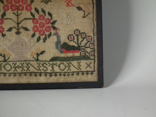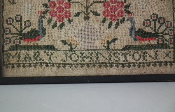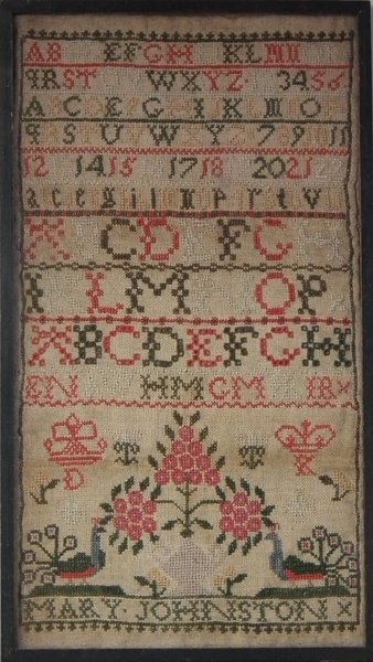 Circa 1830. 17ins hight by 9.25ins wide. Scottish Sampler by Mary Johnston. Framed in an old wood frame with glass.