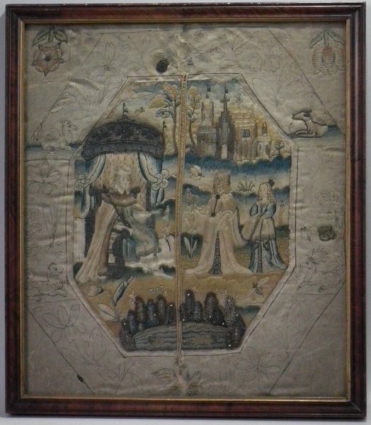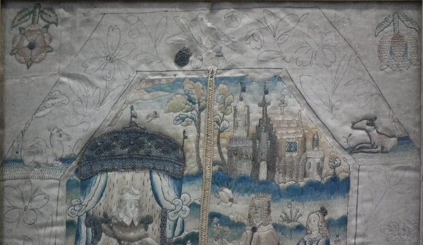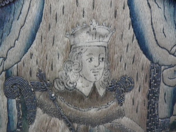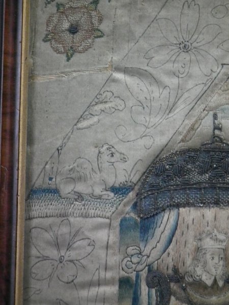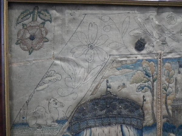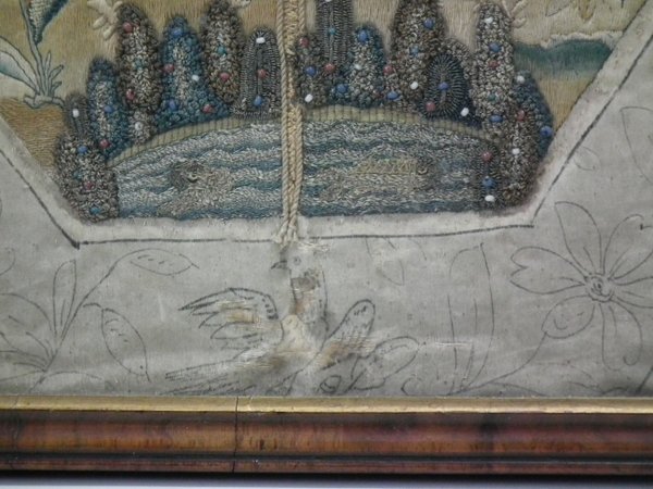 Mid-late 17thC, Circa 1680. 13.25ins high by 11.5ins wide. Charles II Antique Silkwork Stumpwork Picture. Framed in an old wood frame with rippled, old glass.