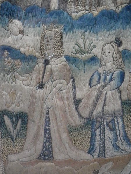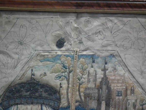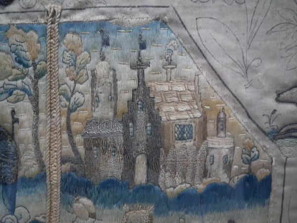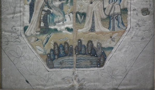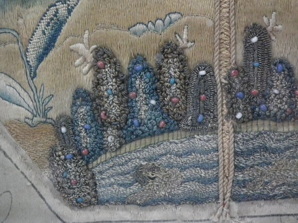The piece is worked in silk, metallic threads and some beading on a silk ground, in a variety of stitches, with areas of raised work.