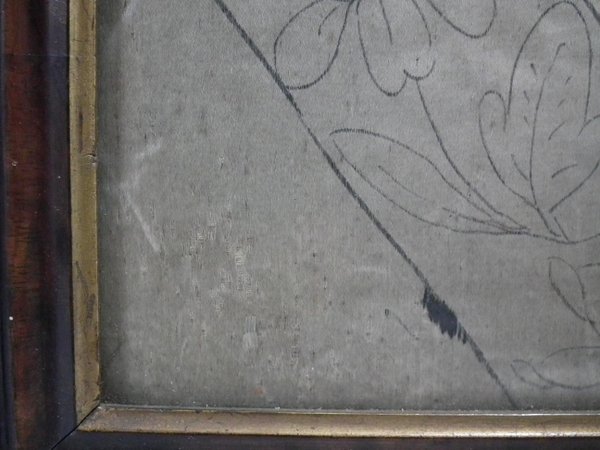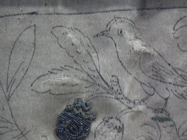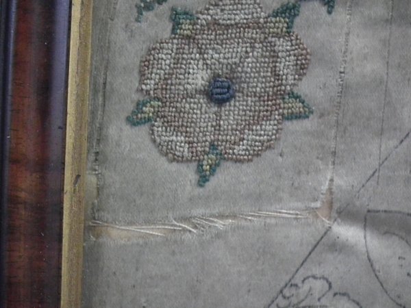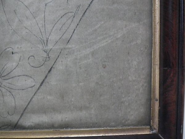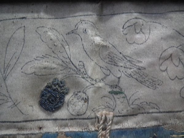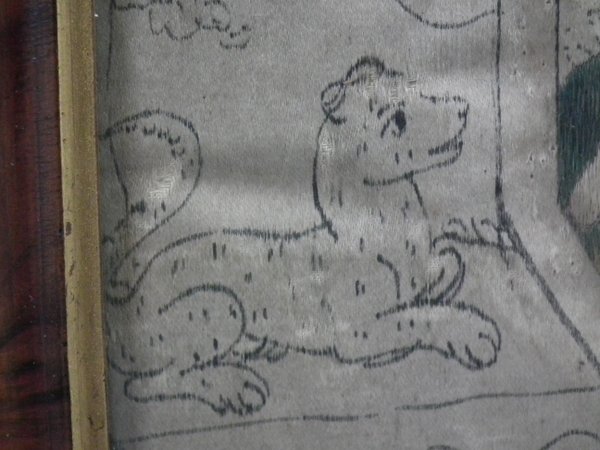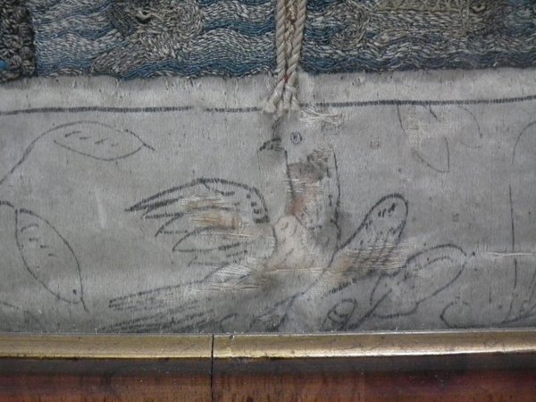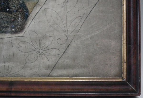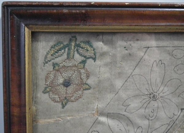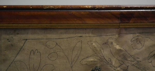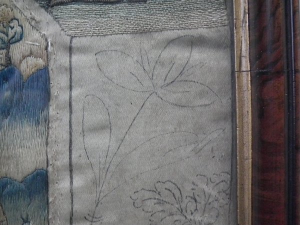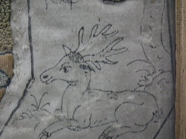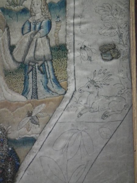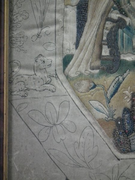 Pictorial border (unfinished), featuring flowers animals and insects. Much of the border is unstitched, leaving only the original pencil line drawings.