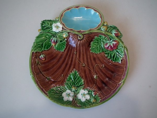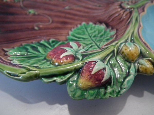 Minton Majolica dish which features strawberry fruit, flowers and leaves.