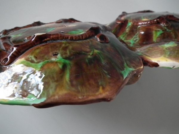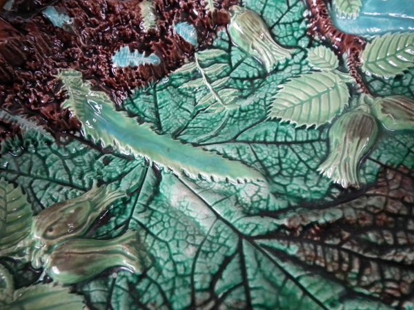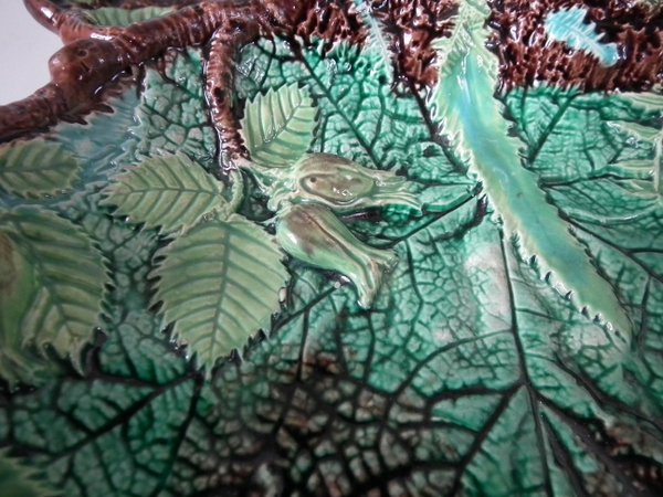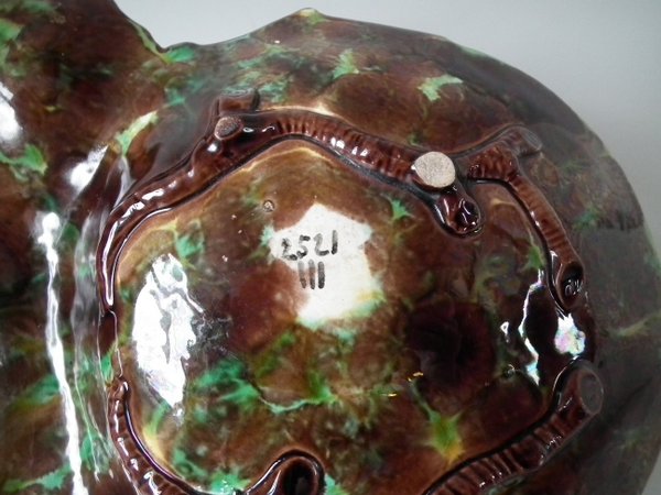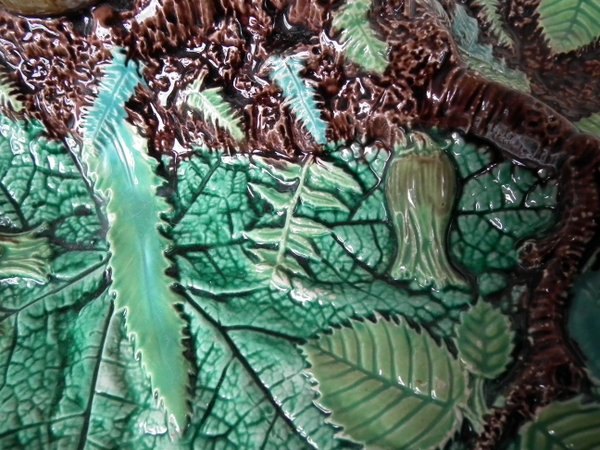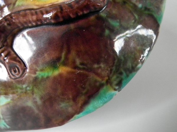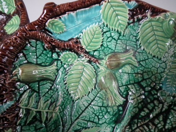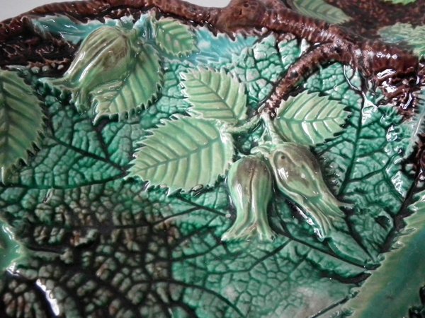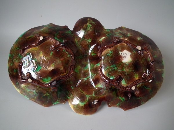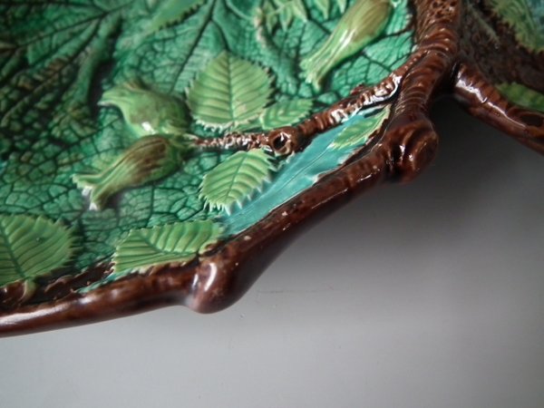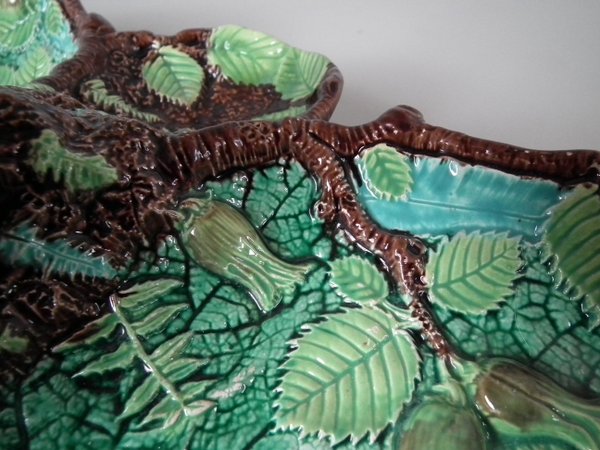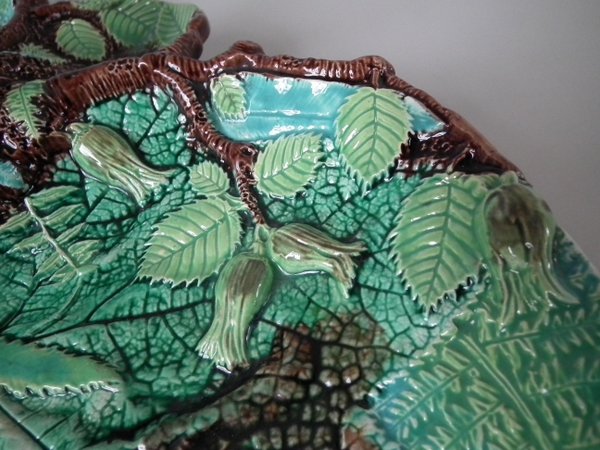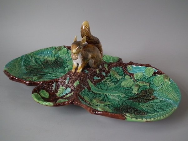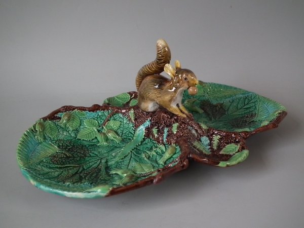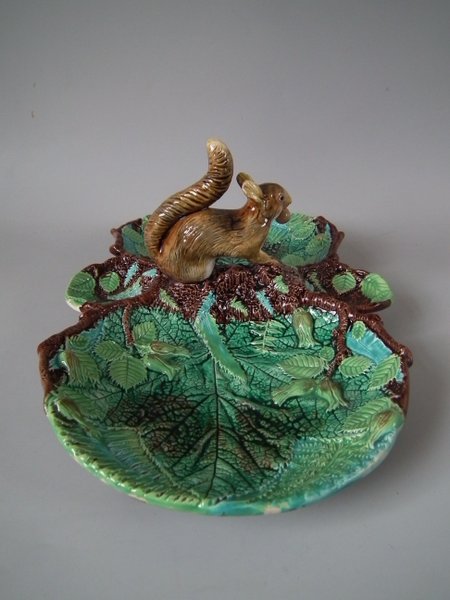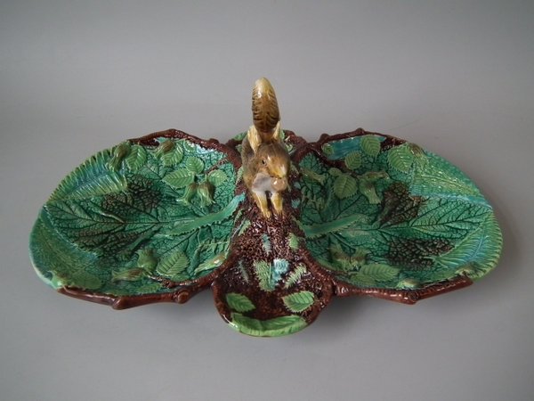 Victorian, circa 1869. 5.3ins high, 13.7ins wide, 8.8ins depth. George Jones Majolica nut dish which features a squirrel holding a nut. Colouration: green, brown, ochre, are predominant.