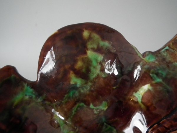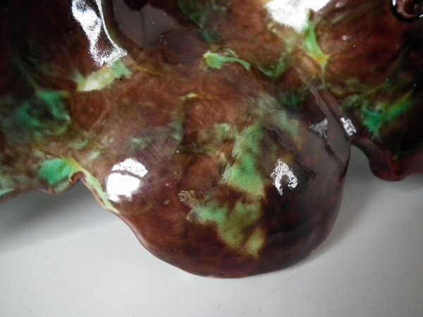KILN EFFECTS: kiln detritus caught in the glaze to one leaf.