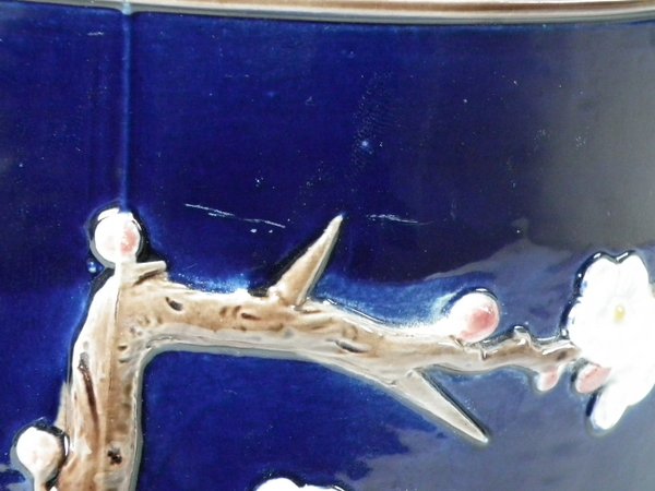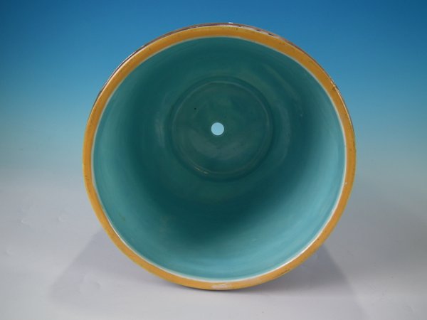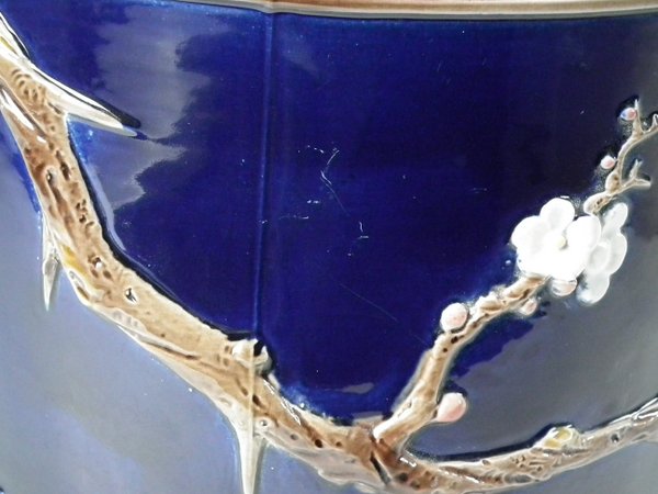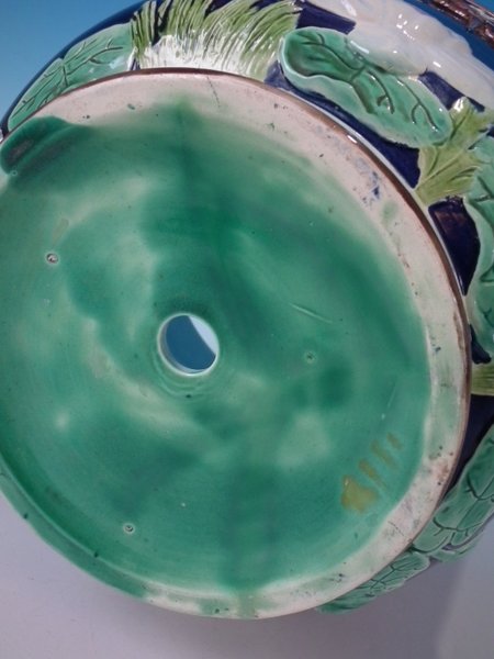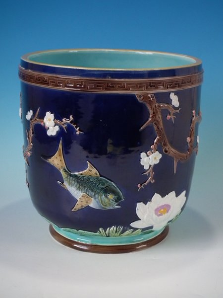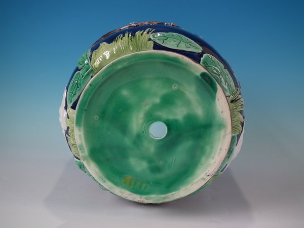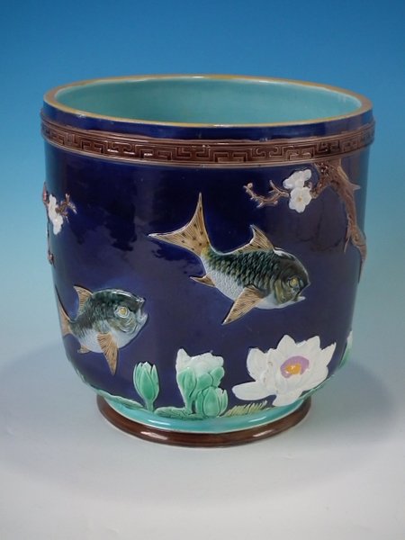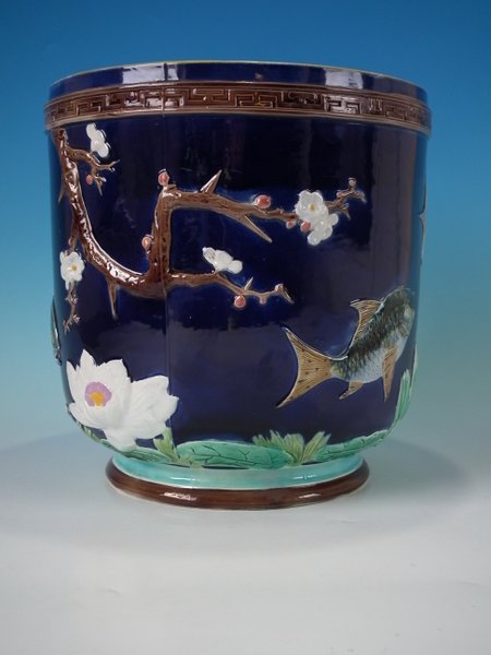 Victorian, circa 1870. 9.6ins high, 9.4ins wide, 9.4ins depth. Holdcroft Majolica jardinière which features fish, water lilies and blossom.
