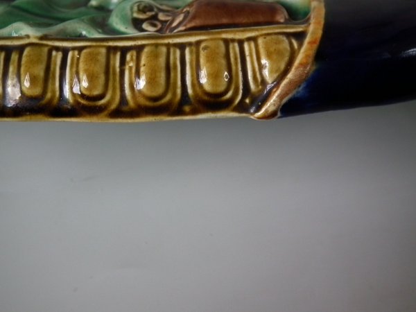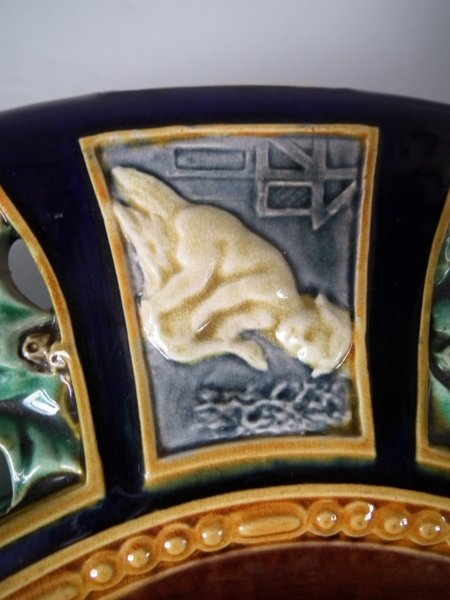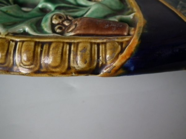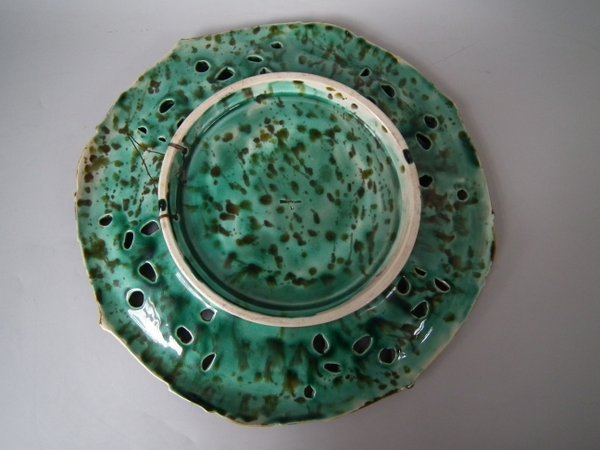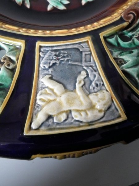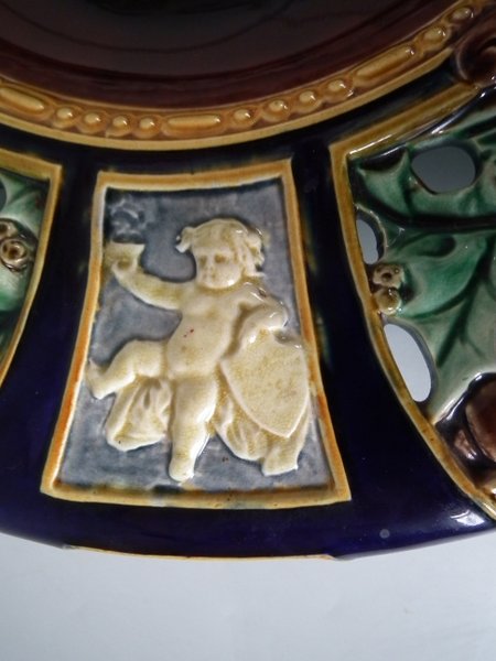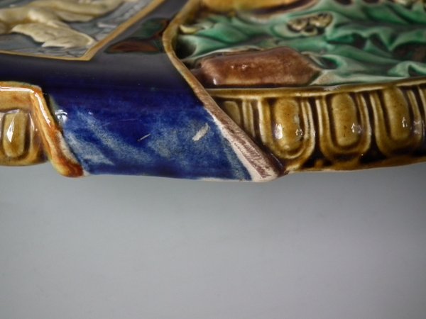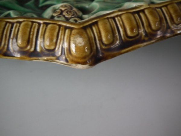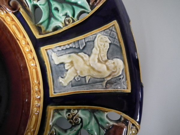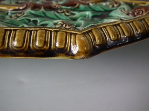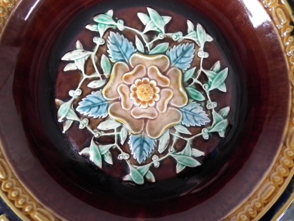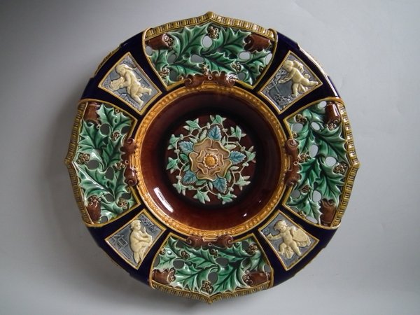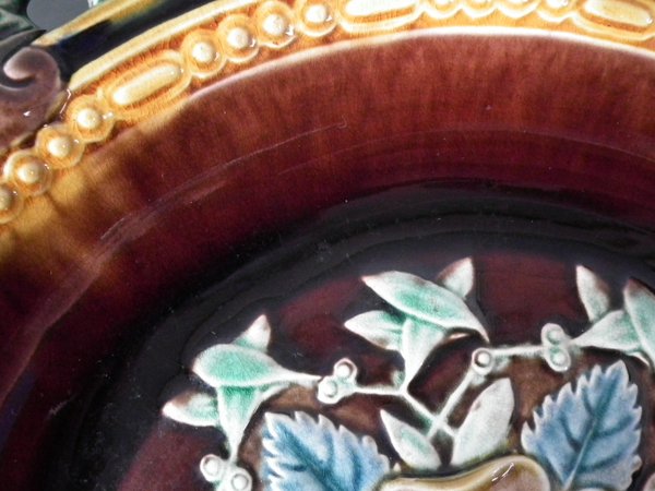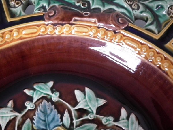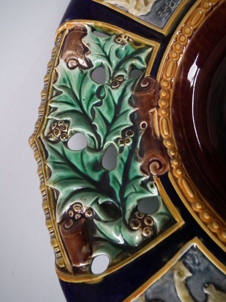 Victorian, circa 1890. 15.7ins high, 15.7ins wide, 2ins depth. Rorstrand Majolica charger which features a Christmas rose surrounded by mistletoe.