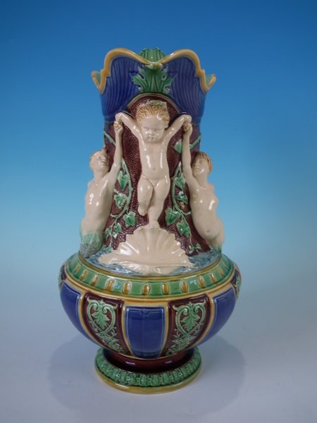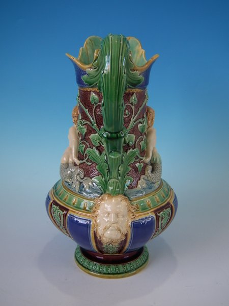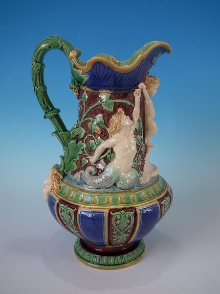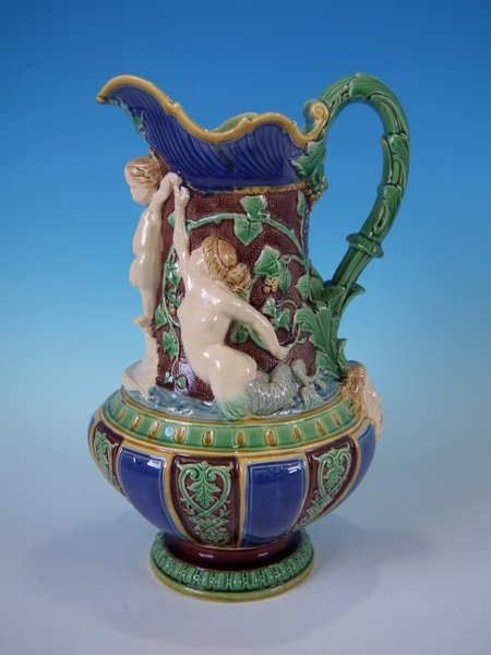Victorian, circa 1863. 12.6ins high, 7.5ins wide, 7.5ins depth. Minton Majolica jug/pitcher with a mythological theme