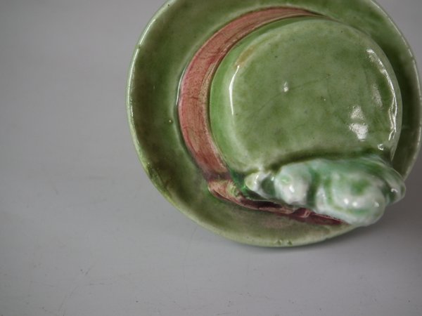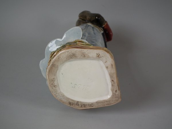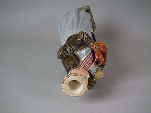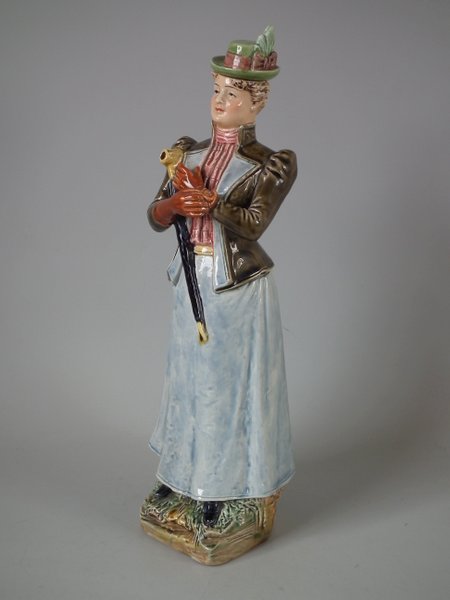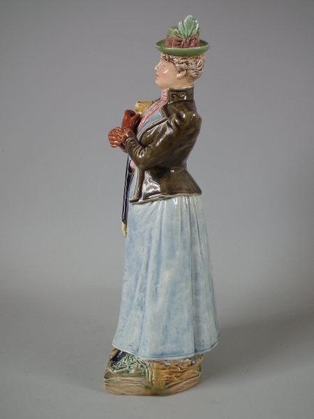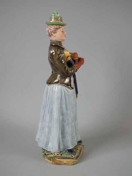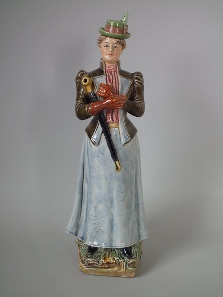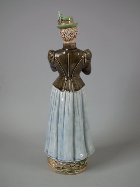 Circa 1890. 12.6ins high, 4.3ins wide, 4.3ins depth. B & L Majolica figural bottle which features a lady in Victorian wear