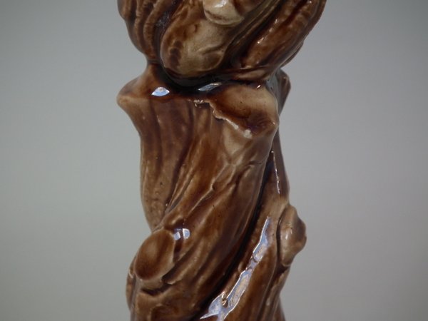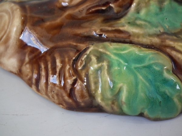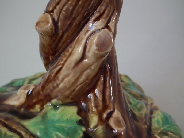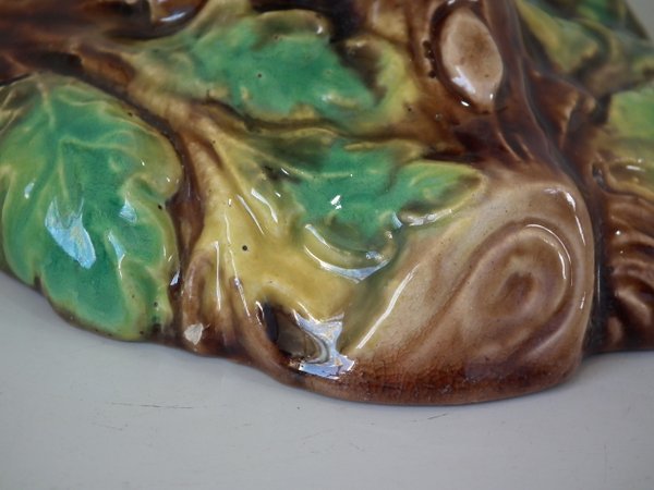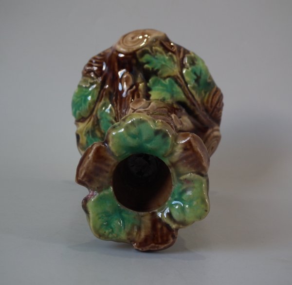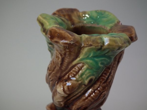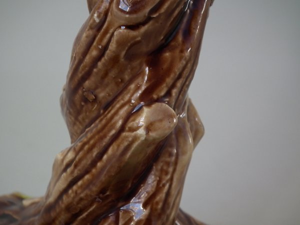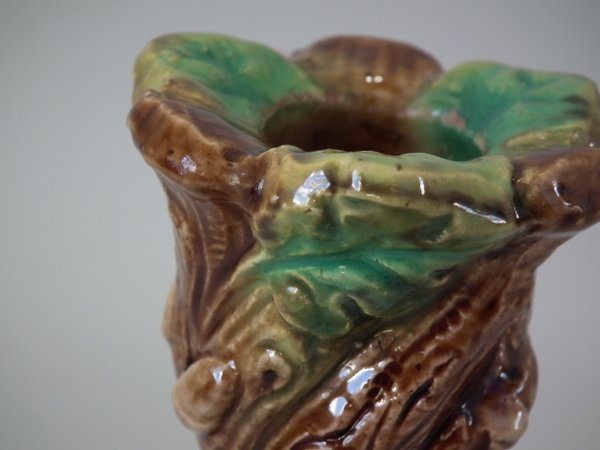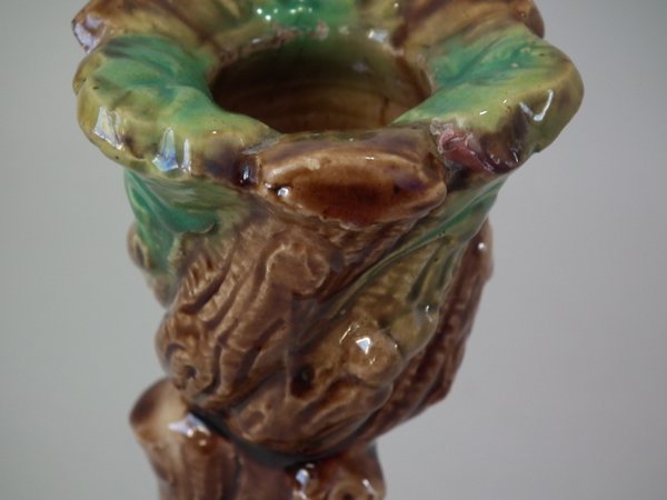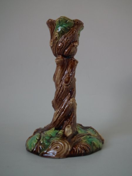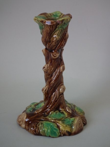 Majolica candlestick holder which features a tree trunk with oak leaves around the base and sconce.