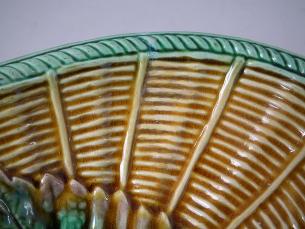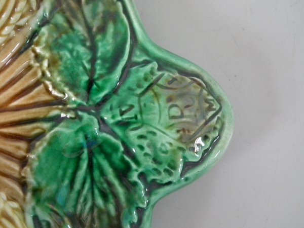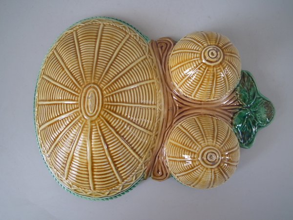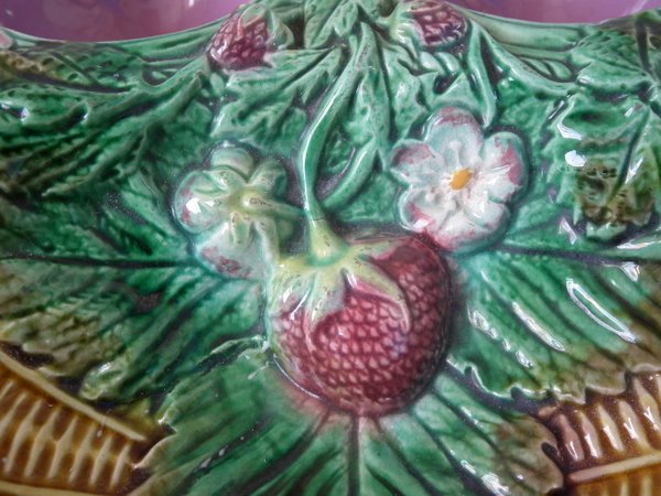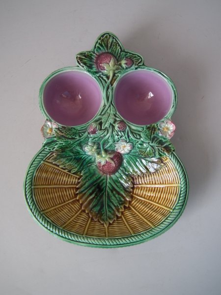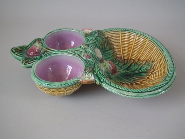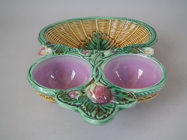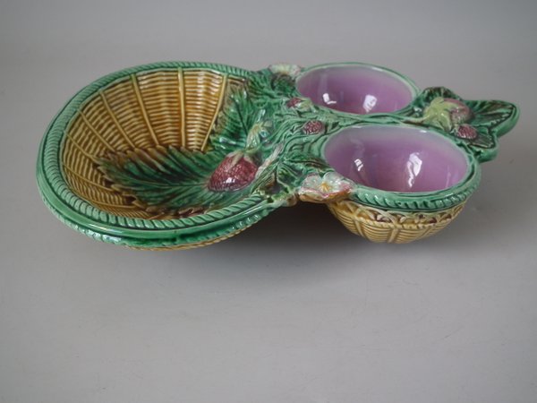 Victorian, circa 1868. 1.8ins high, 3ins wide, 9.3ins depth. Unidentified English Majolica strawberry server which features a basket with two wells decorated with strawberries, leaves and blossom.