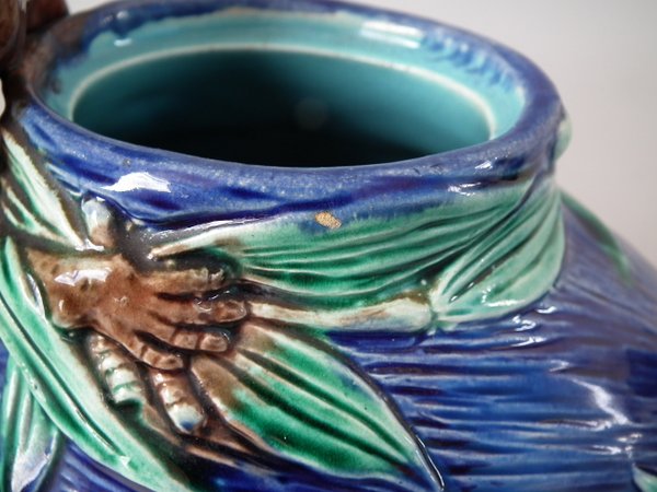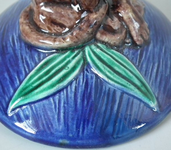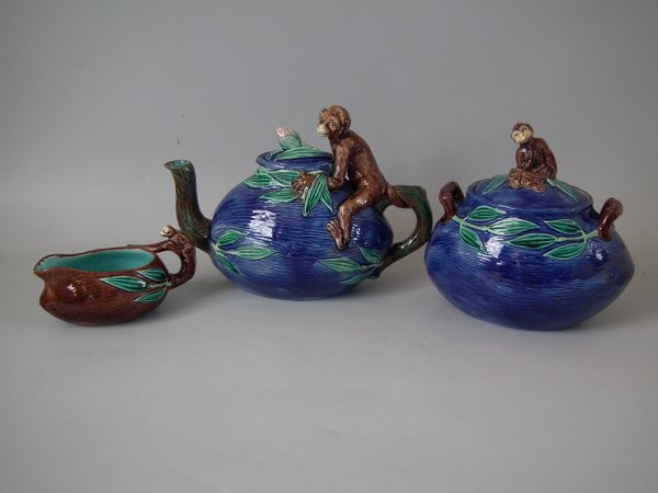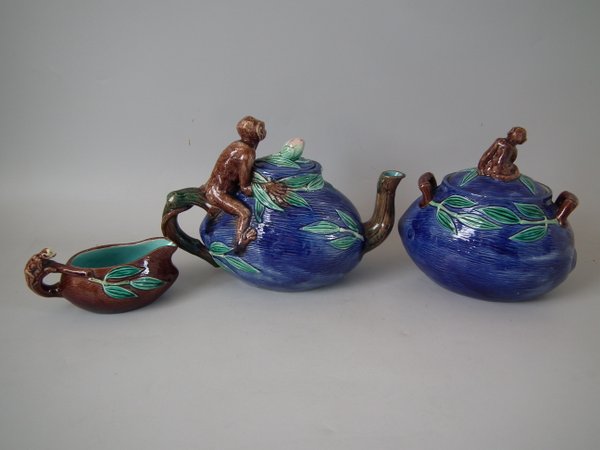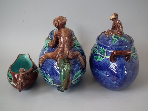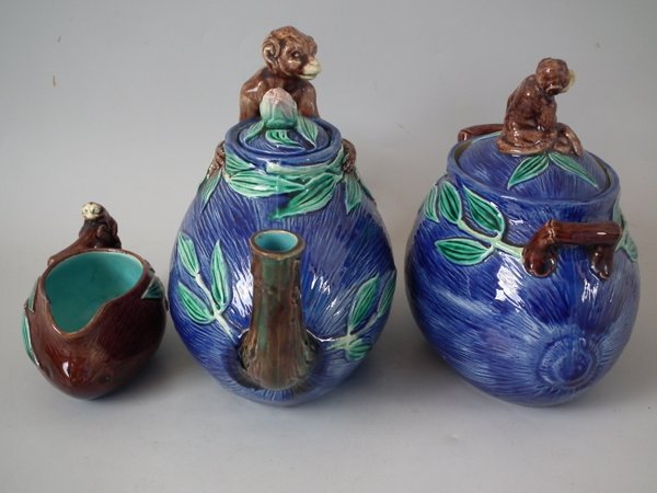 Victorian, circa 1880. 7.5ins high, 9.8ins wide, 4.7ins depth. J.R.L. Majolica teapot, sugar pot and creamer which features coconuts and monkeys. Colouration: turquoise, brown, green, are predominant.