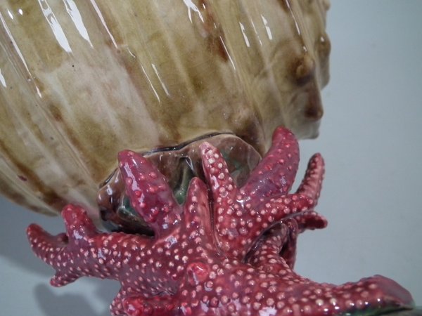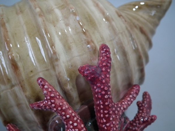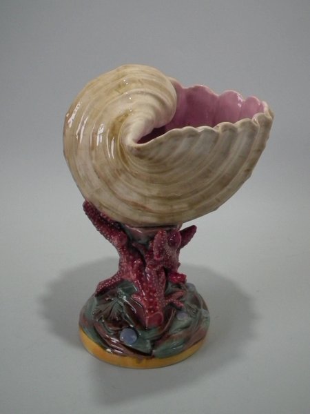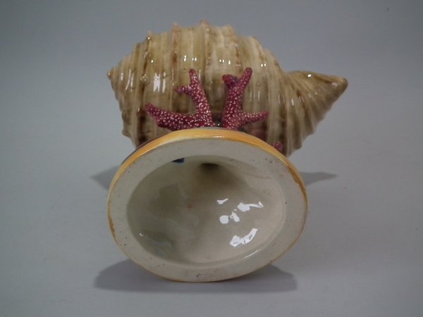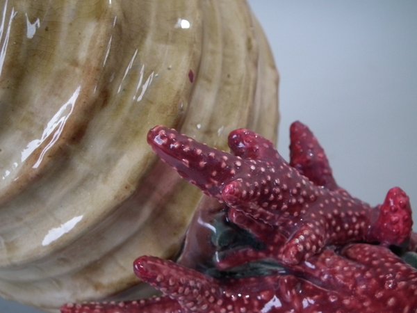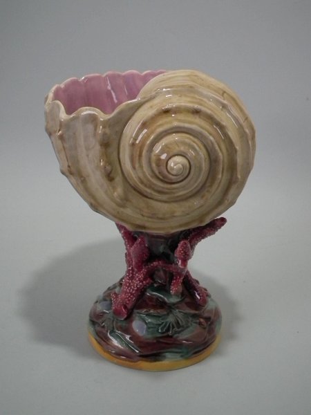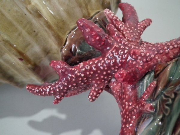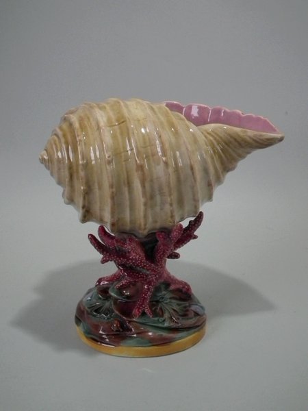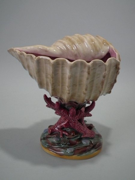 Victorian, circa 1875. 8.1ins high, 7.9ins wide, 5.9ins depth. Copeland Majolica serving dish which features a conch shell