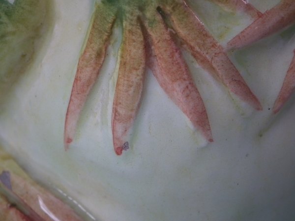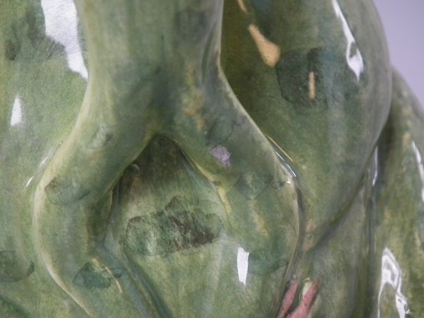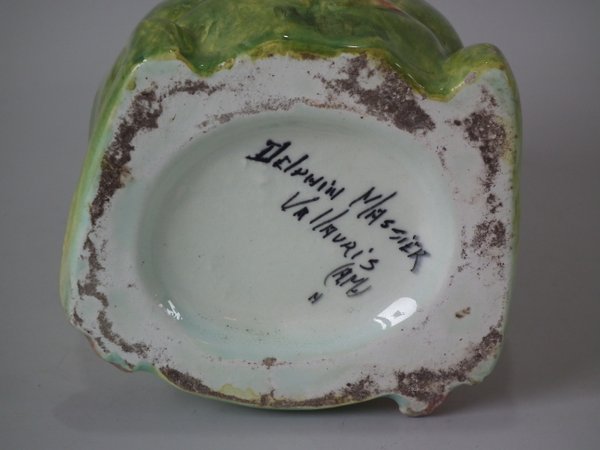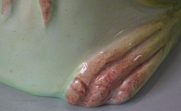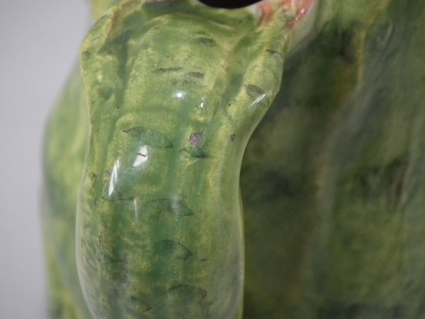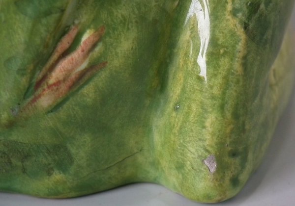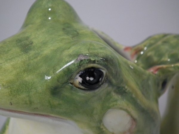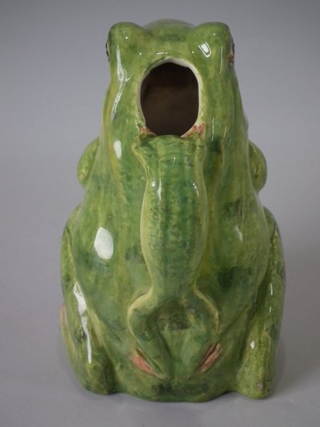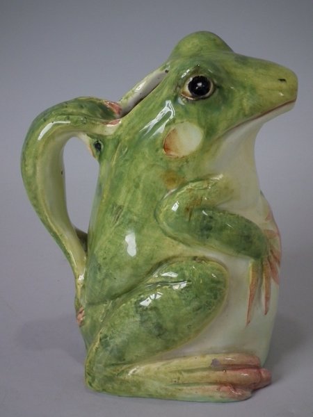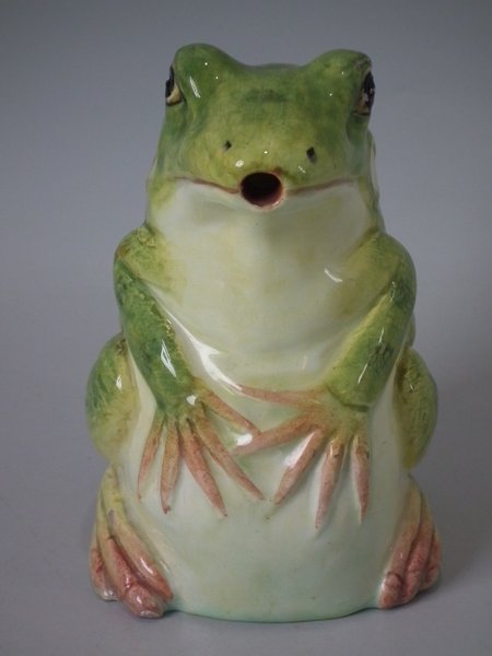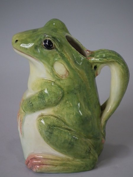Victorian, circa 1900. 6ins high, 4.9ins wide, 3.4ins depth. Delphin Massier Majolica jug/pitcher which features a frog figural, with another frog molded as the handle. Colouration: green, cream, pink, are predominant.