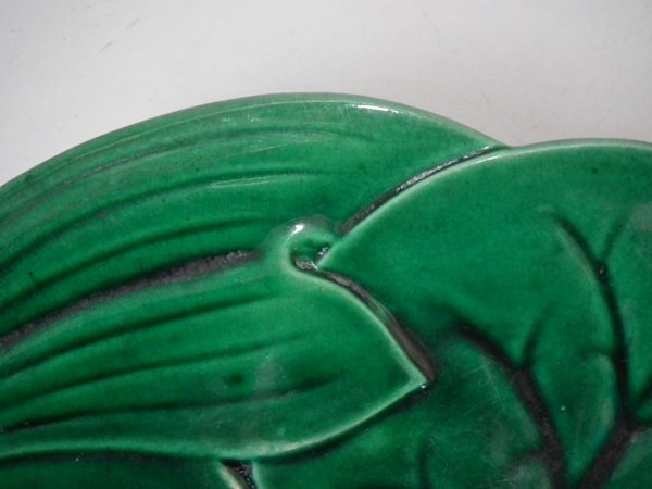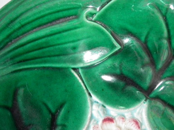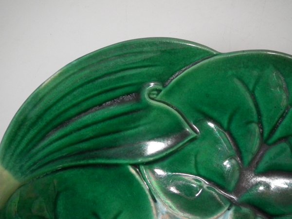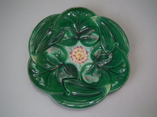 Victorian, circa 1869. 9.1ins high, 9.1ins wide, 1ins depth. George Jones Majolica plate which features a pond lily flower