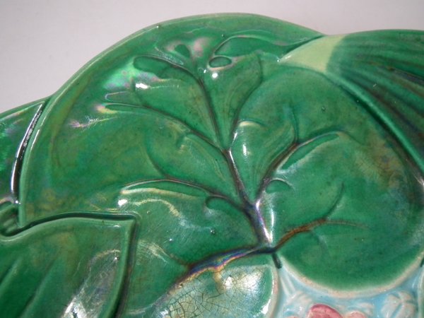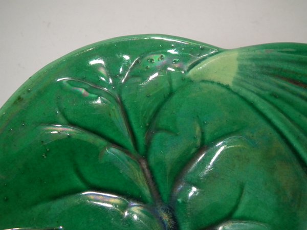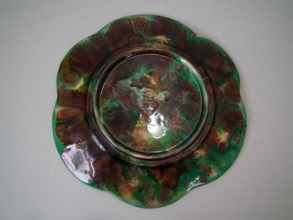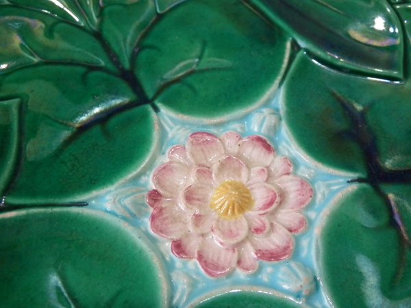 Victorian, circa 1869. 9.1ins high, 9.1ins wide, 1ins depth. George Jones Majolica plate which features a pond lily flower