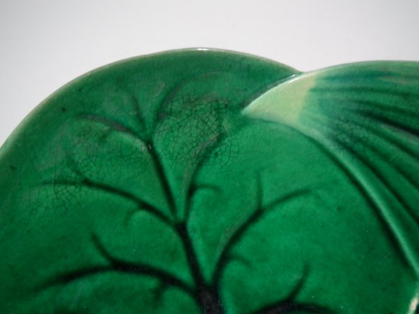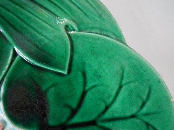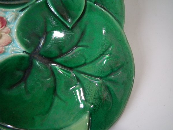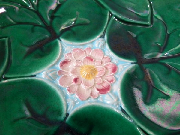 Victorian, circa 1869. 9.1ins high, 9.1ins wide, 1ins depth. George Jones Majolica plate which features a pond lily flower