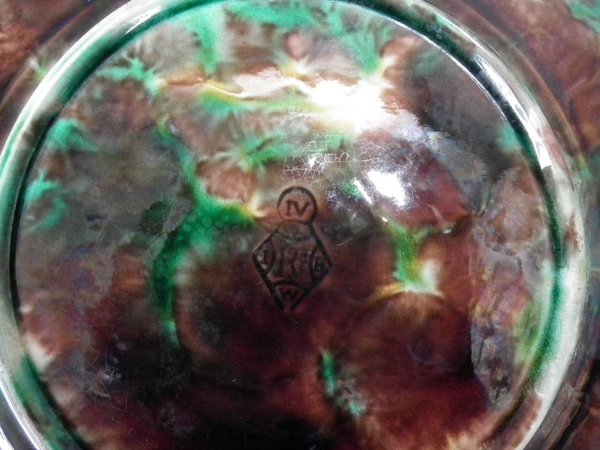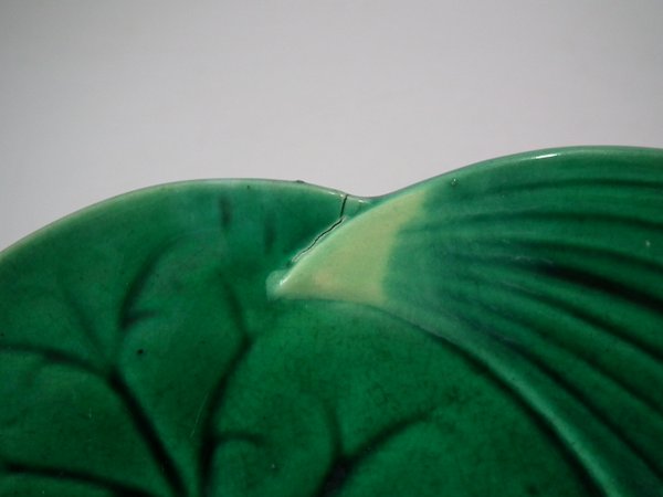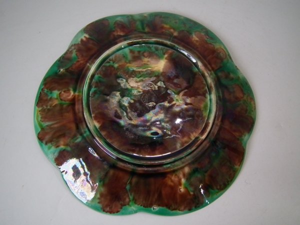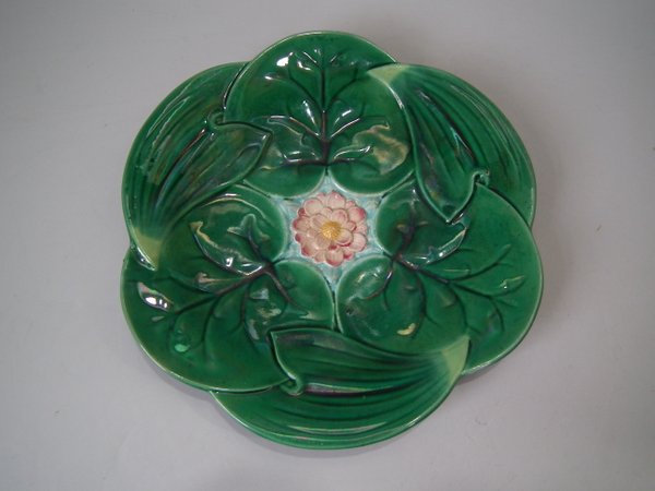 Victorian, circa 1869. 9.1ins high, 9.1ins wide, 1ins depth. George Jones Majolica plate which features a pond lily flower
