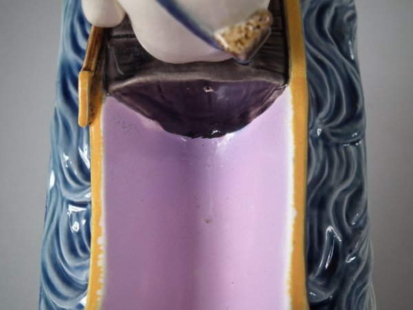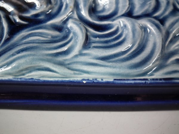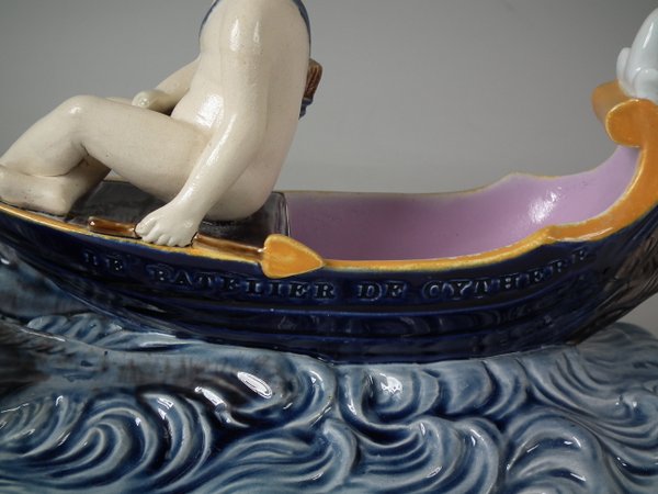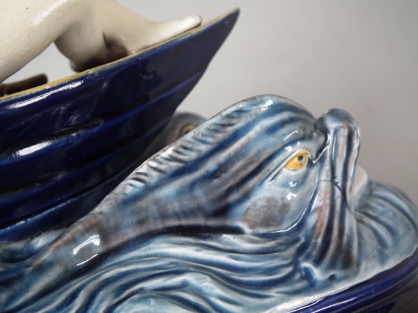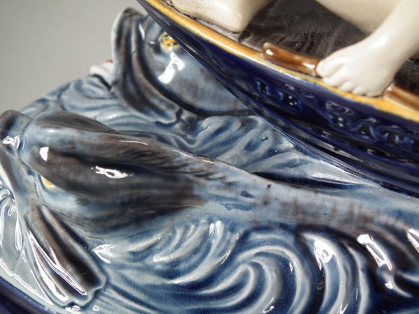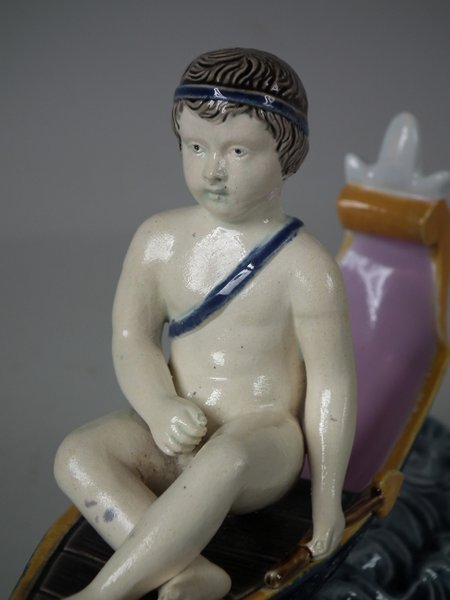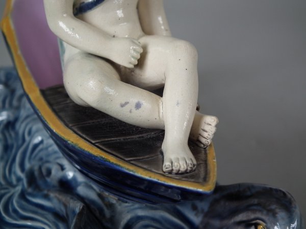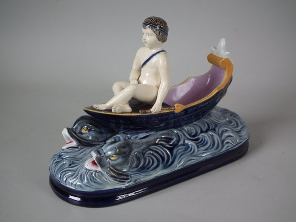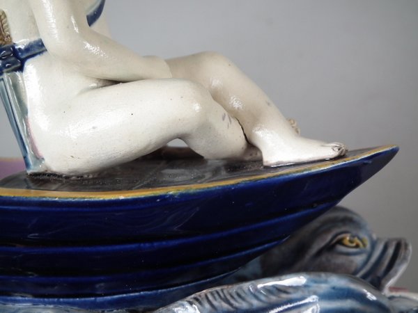 Holdcroft Majolica figure which features a boy seated on a boat with two dolphins in the water below.