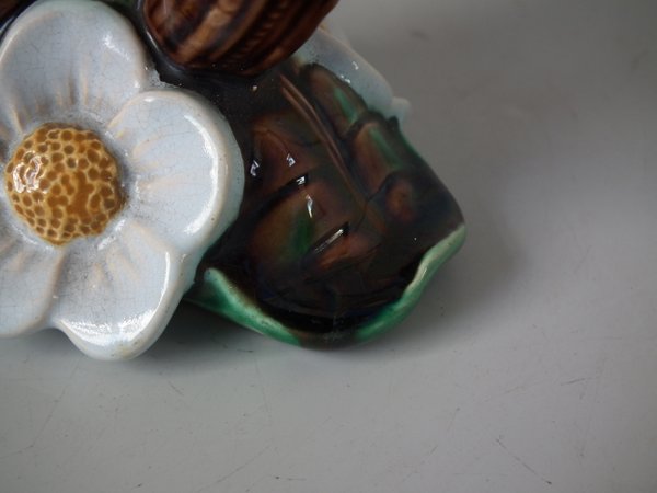Holdcroft Majolica posy holder which features three trumpet shape vases with lilies and lily pads.