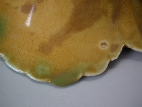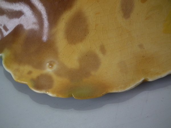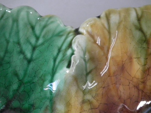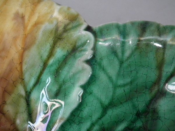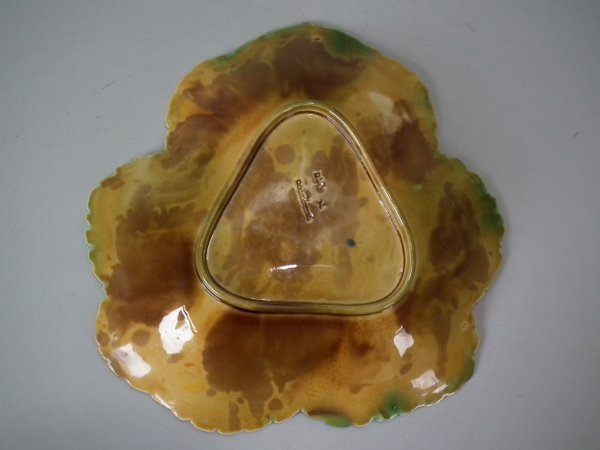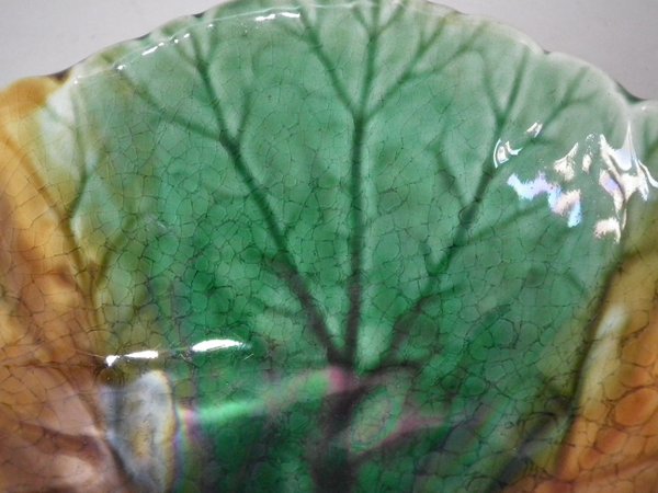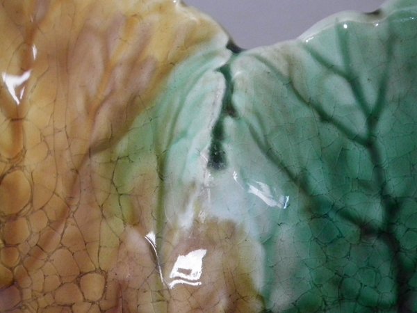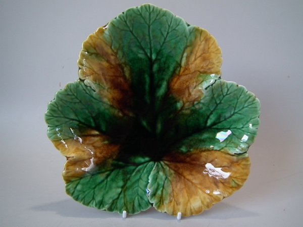 Victorian, circa 1862. 8.9ins high, 8.7ins wide, 1.4ins depth. Wedgwood Majolica dish which features a large leaf. Colouration: green, brown, ochre, are predominant.