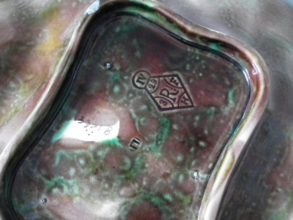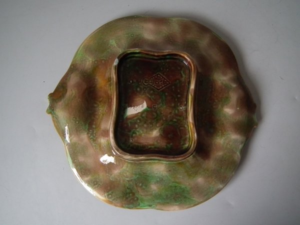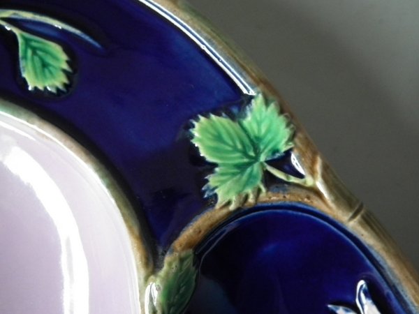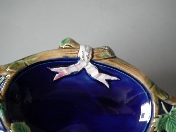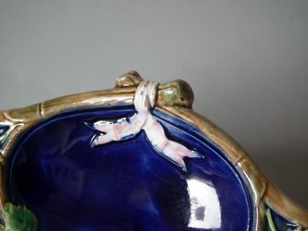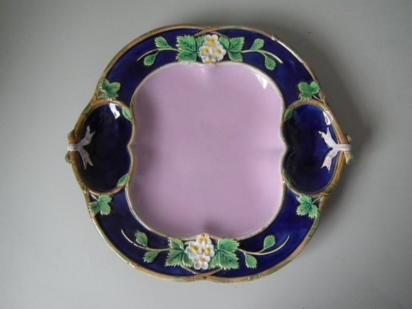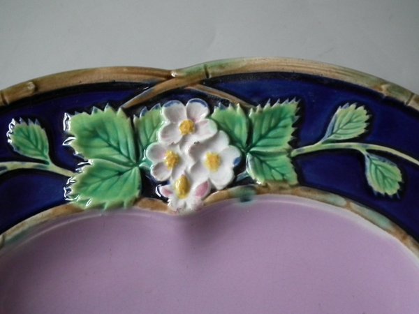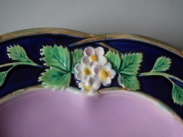 Victorian, circa 1872. 9.1ins high, 9.6ins wide, 1.4ins depth. George Jones Majolica serving dish which features strawberries,
