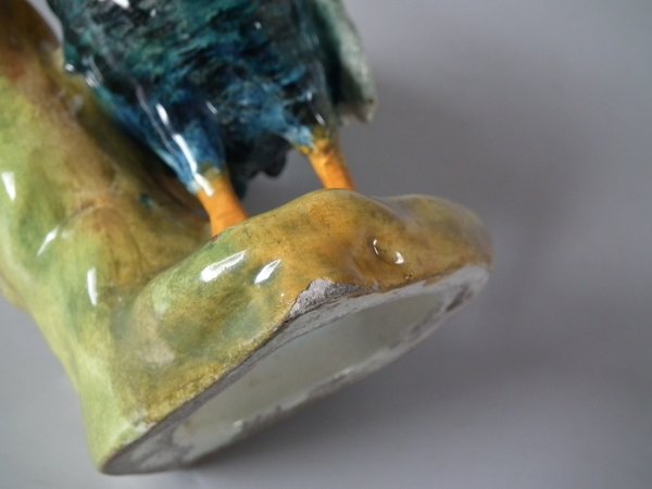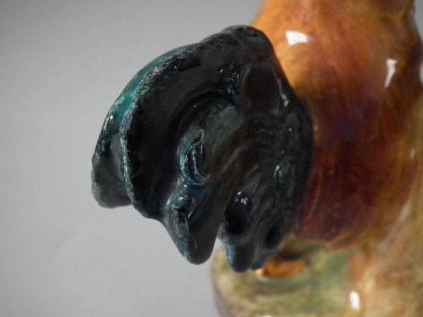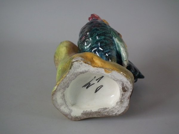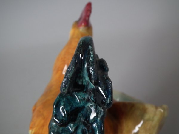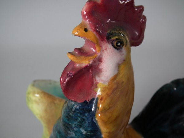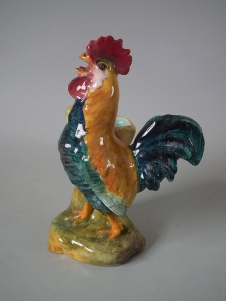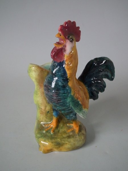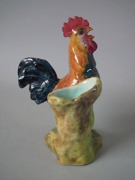 Circa 1900. 7.1ins high, 5.1ins wide, 3.5ins depth. Delphin Massier Majolica posy holder which features a cockerel.
