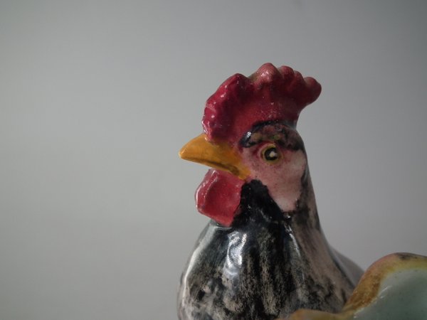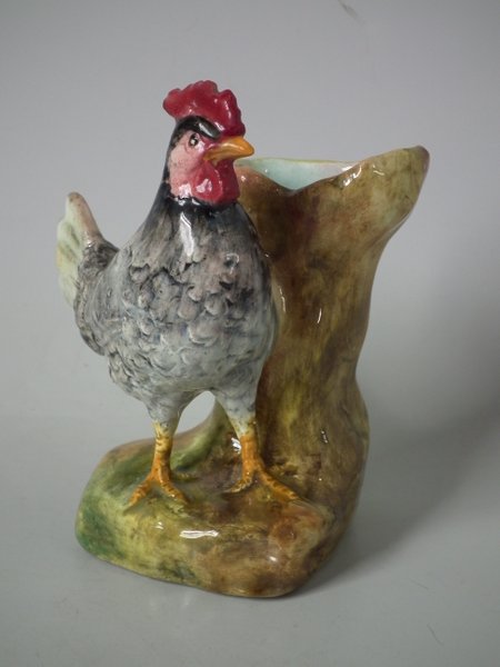Circa 1900. 5.5ins high, 4.3ins wide, 3.9ins depth. Delphin Massier Majolica vase which features a hen