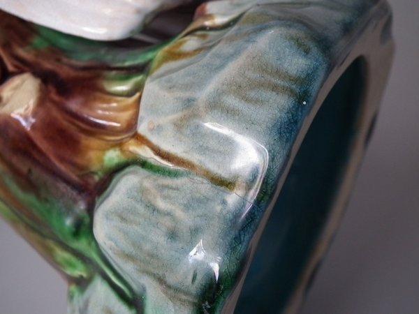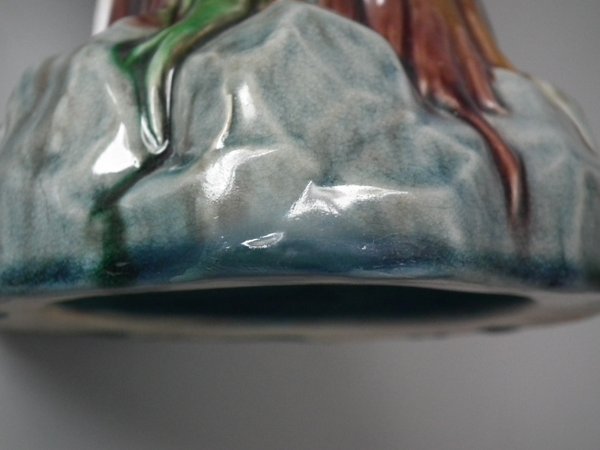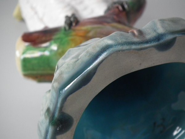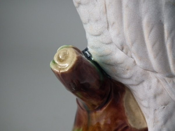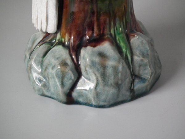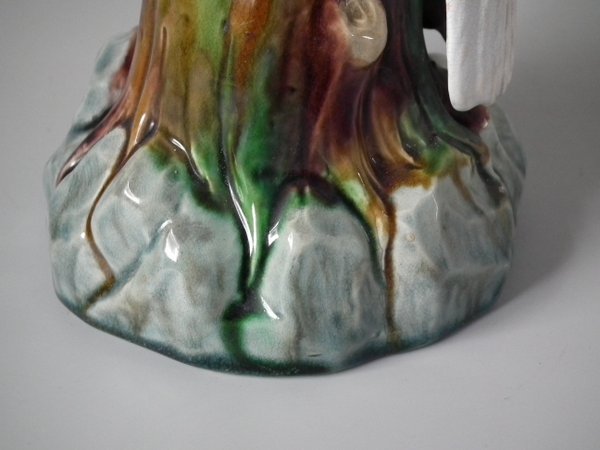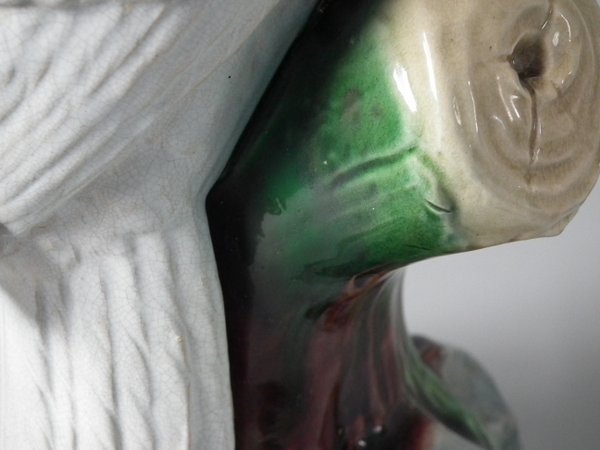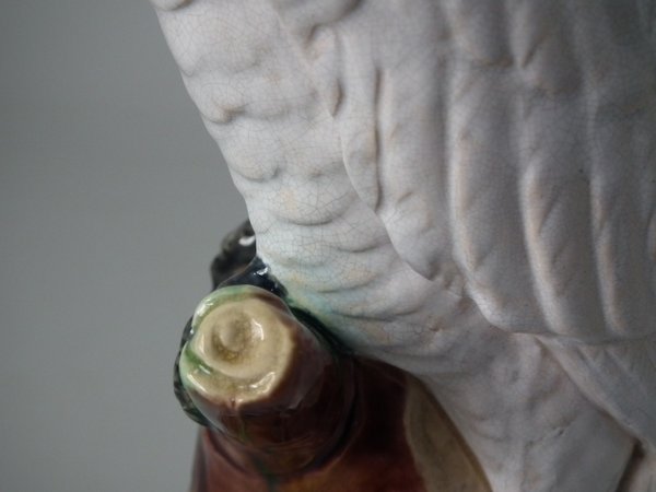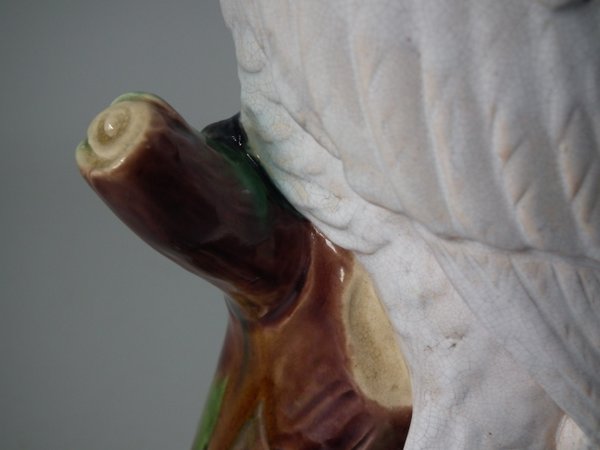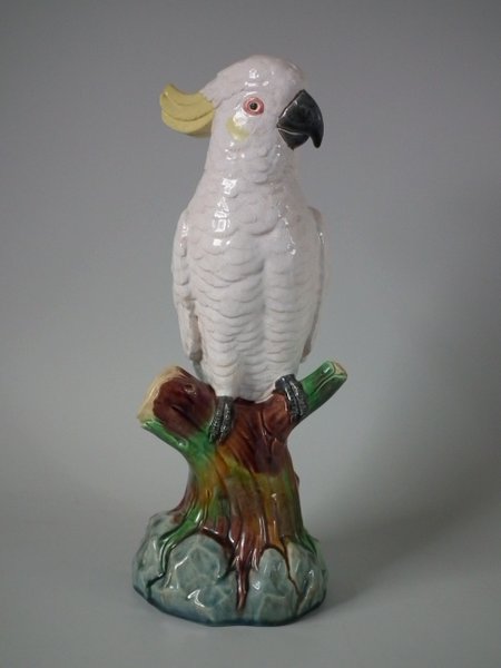 Victorian, circa 1875. 12.2ins high, 4.3ins wide, 4.7ins depth. Mintons Majolica figure which features a cockatoo perched on a tree stump.