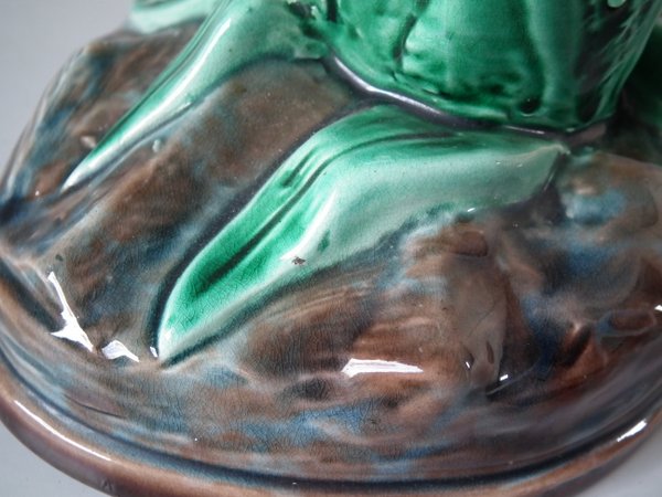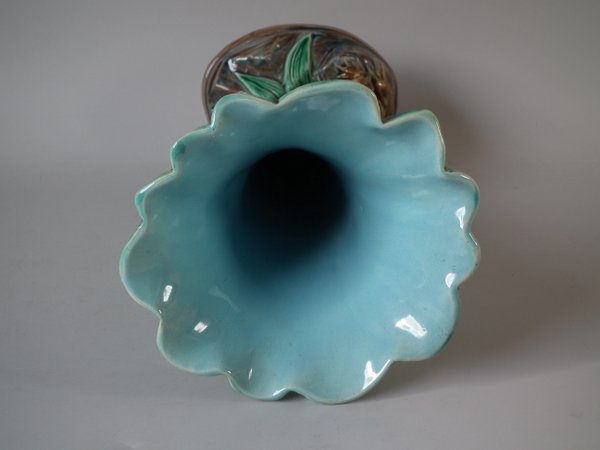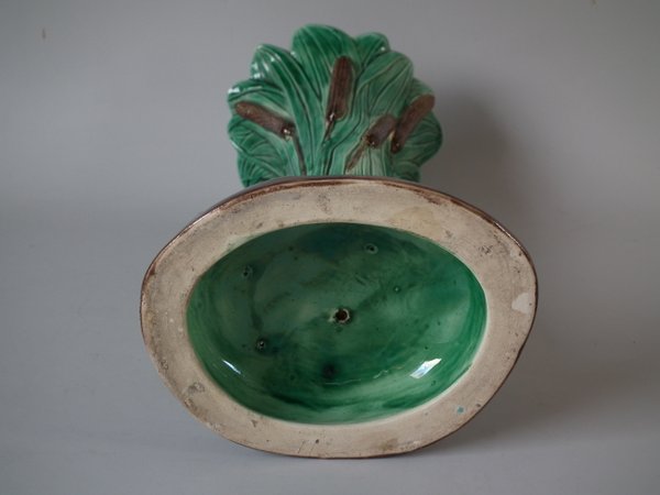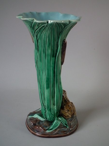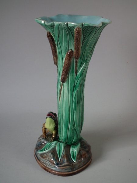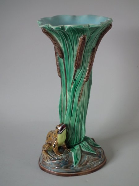 Victorian, circa 1880. 11.4ins high, 5.5ins wide, 5.3ins depth. Holdcroft Majolica vase which features a frog next to bulrushes.