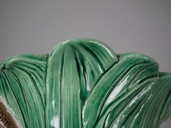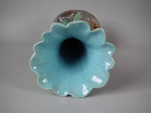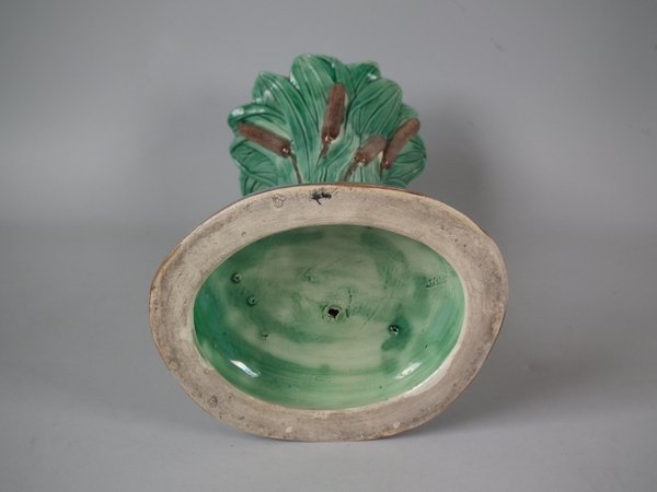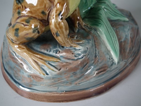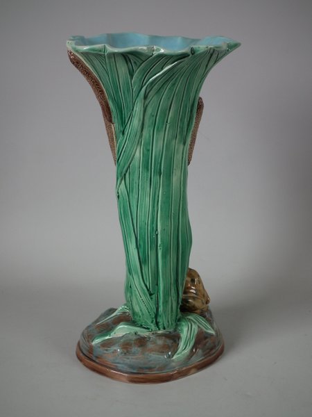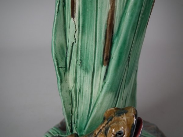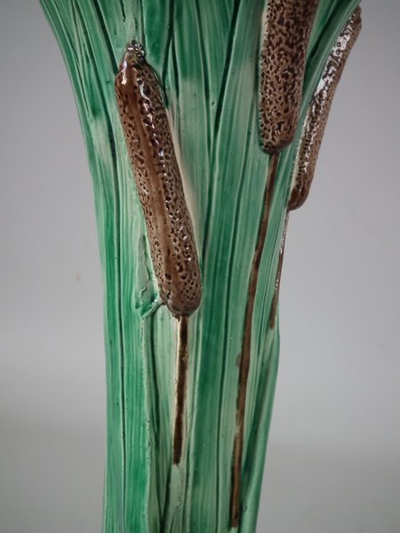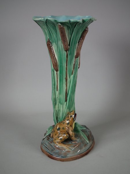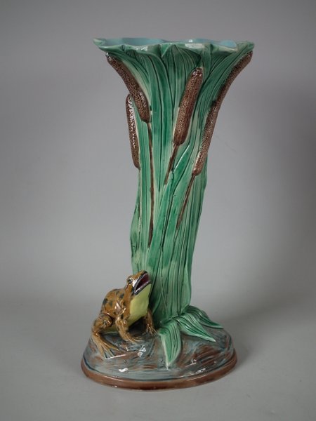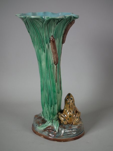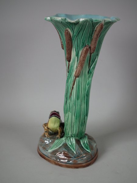 Holdcroft Majolica vase which features a frog next to bulrushes.