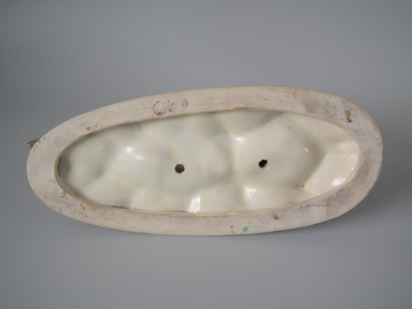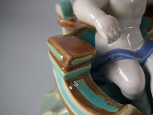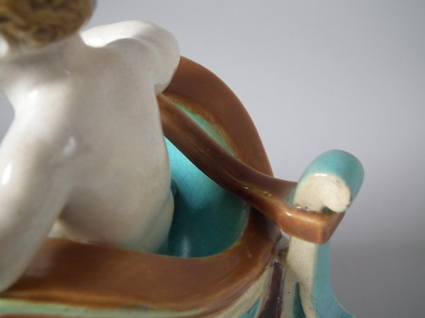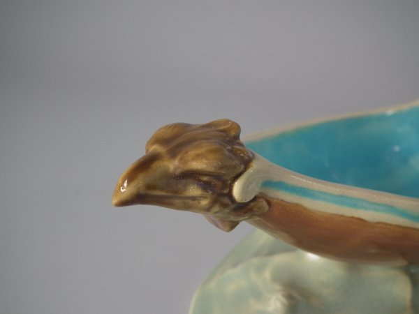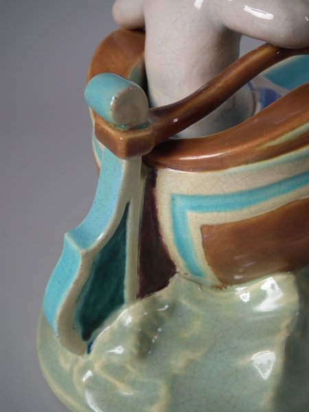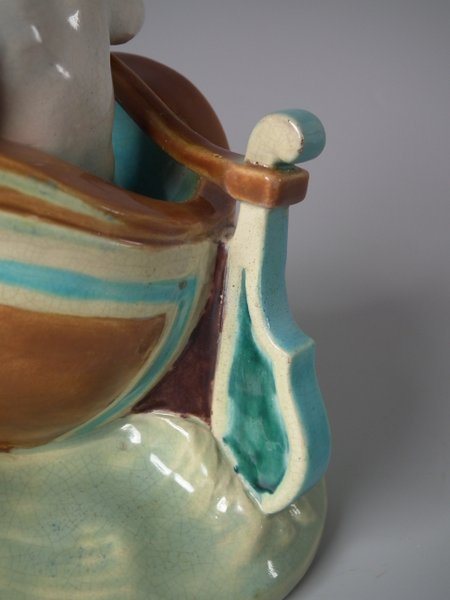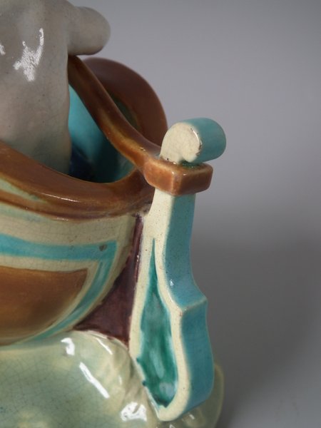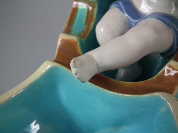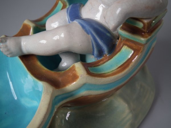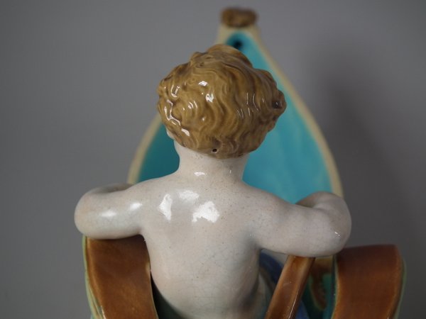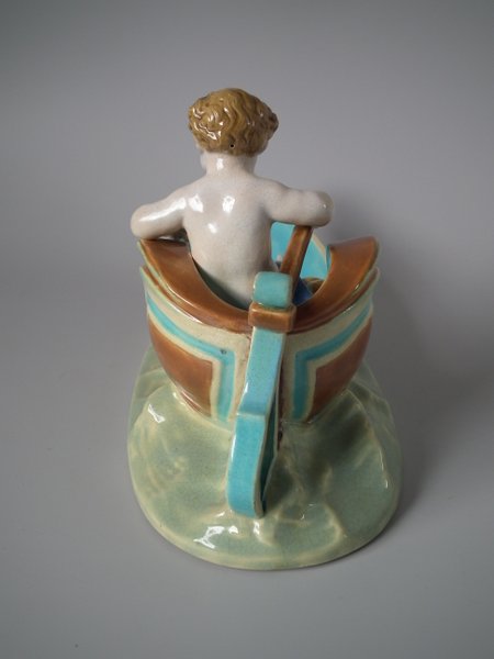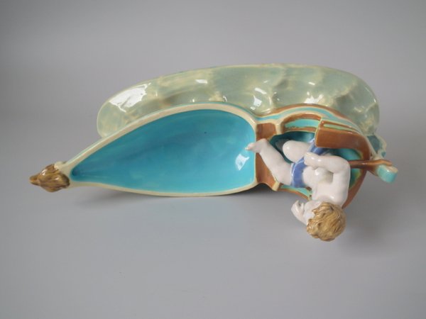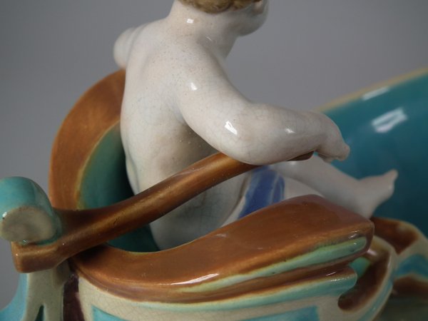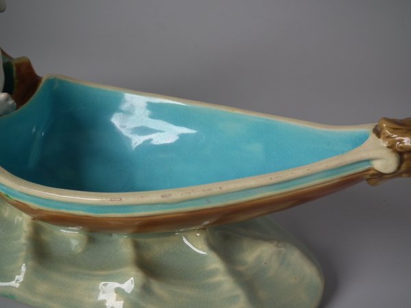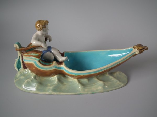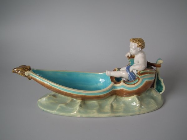 Victorian, circa 1880. 5.5ins high, 11.6ins wide, 4.5ins depth. Royal Worcester Majolica serving dish which features a putto seated on a gondola boat.