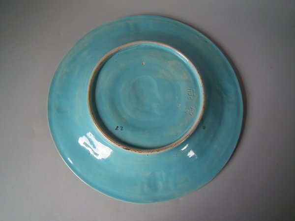 Victorian, circa 1873. 12.2ins high, 12.2ins wide, 1.4ins depth. Minton Majolica platter which features a portrait panel to the centre,