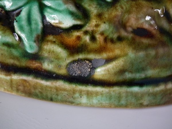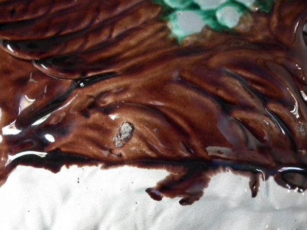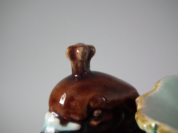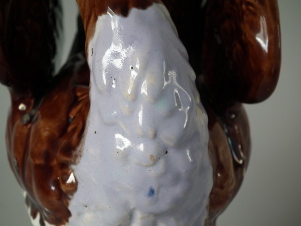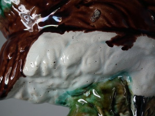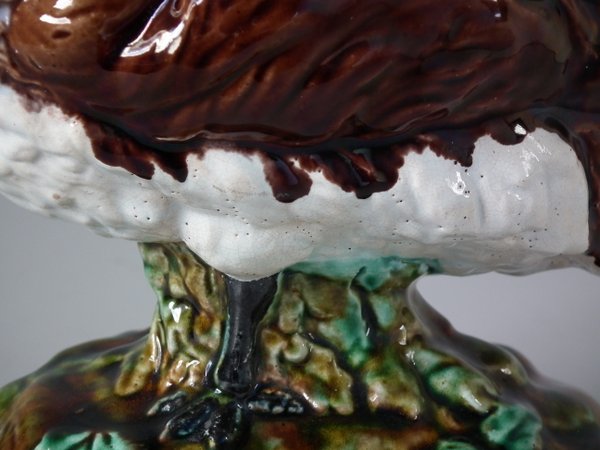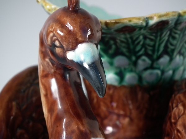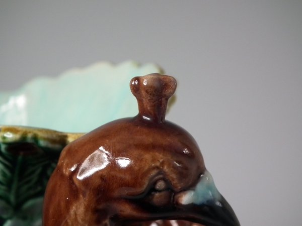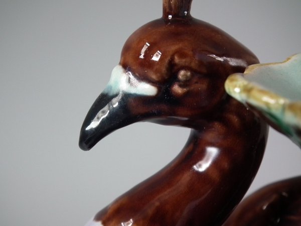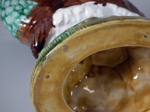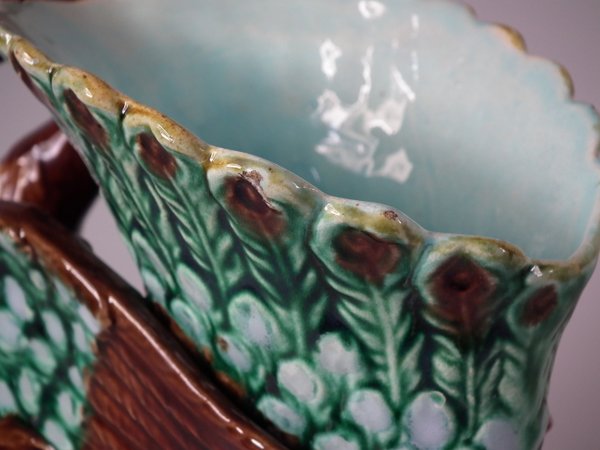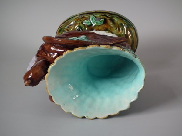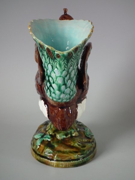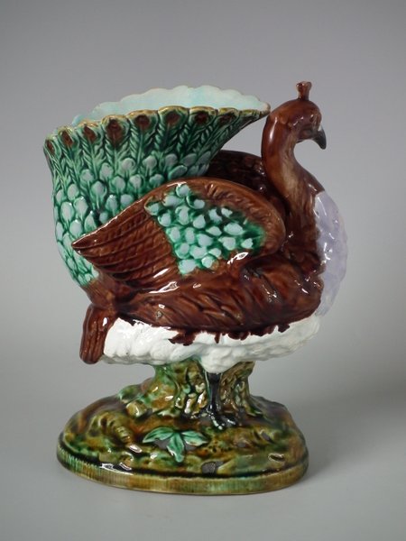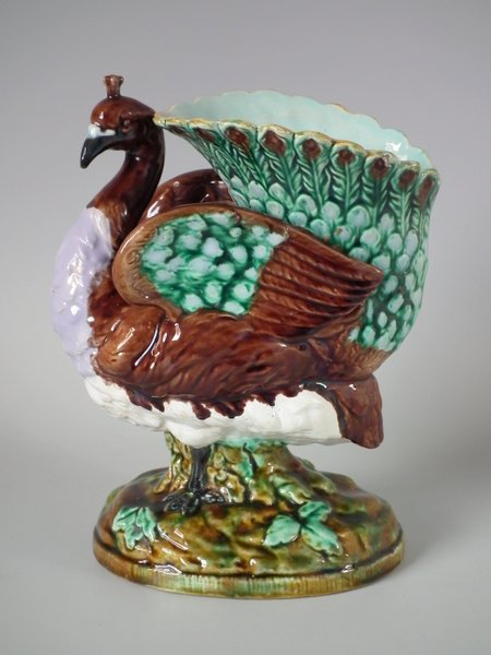 Victorian, circa 1880. 9.4ins high, 7.1ins wide, 4.7ins depth. Majolica vase which features a peacock.