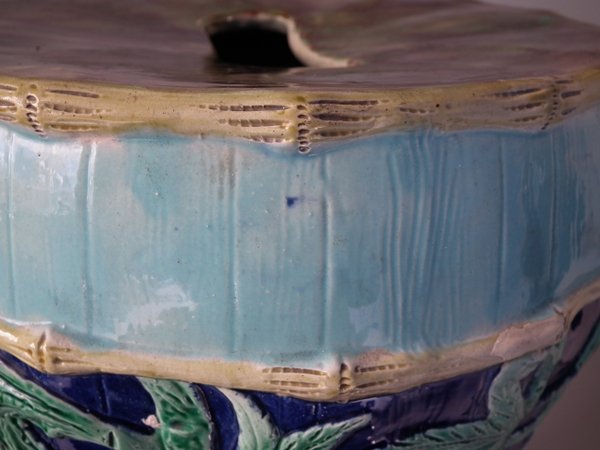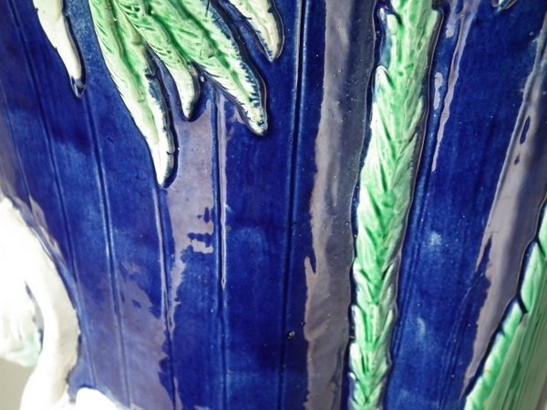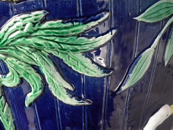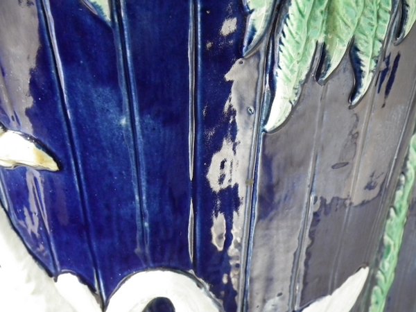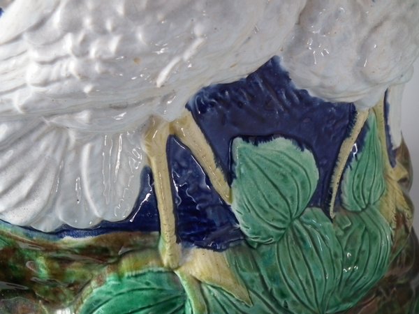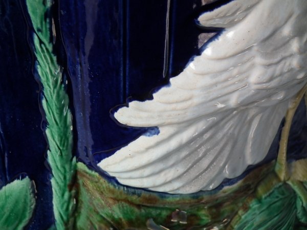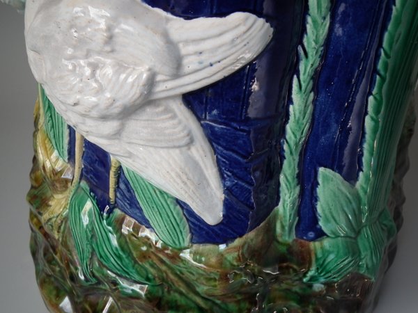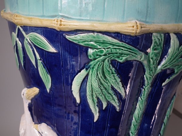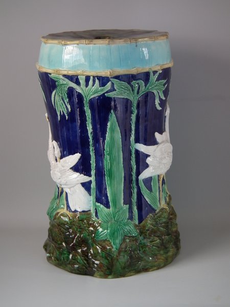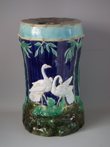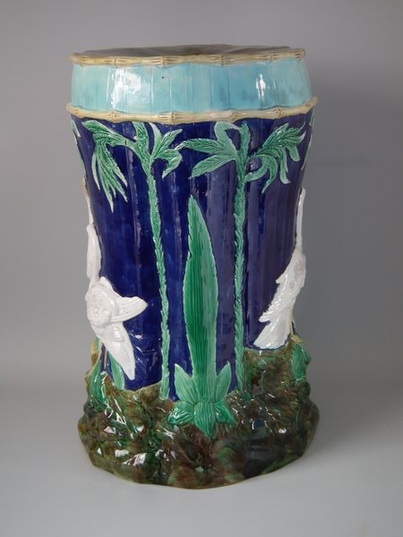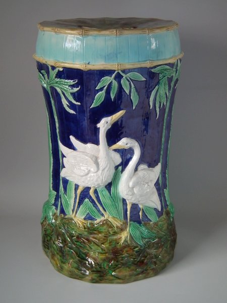 Victorian, circa 1880. 20.9ins high, 12.2ins wide, 12.2ins depth. Forester Majolica garden seat which features storks