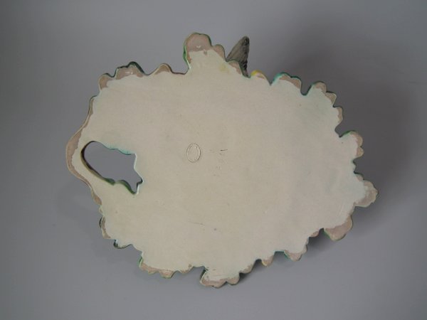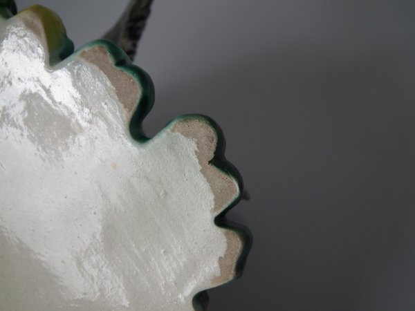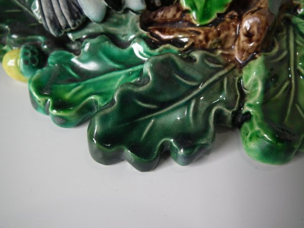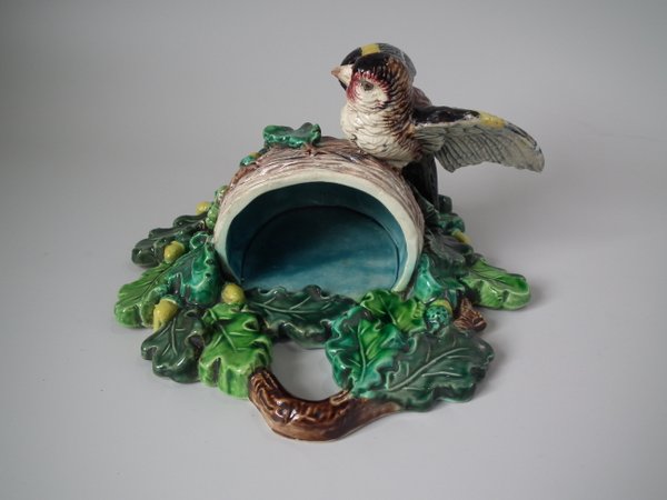 Lonitz Majolica wall pocket which features a goldfinch attending it's nest, surrounded by oak leaves and acorns.