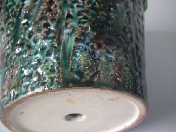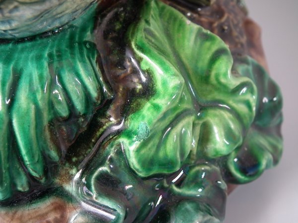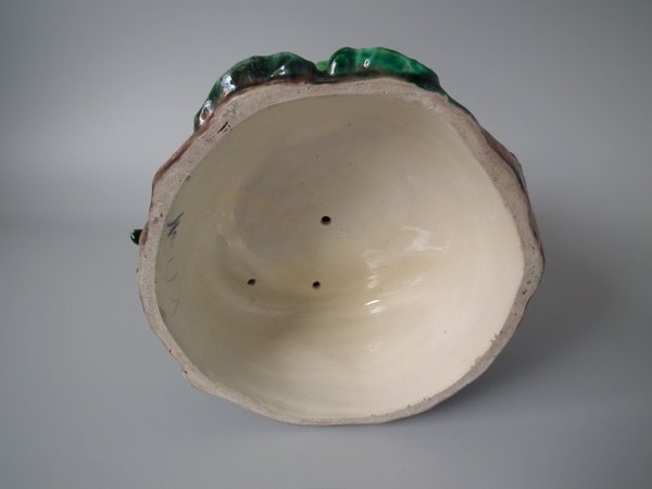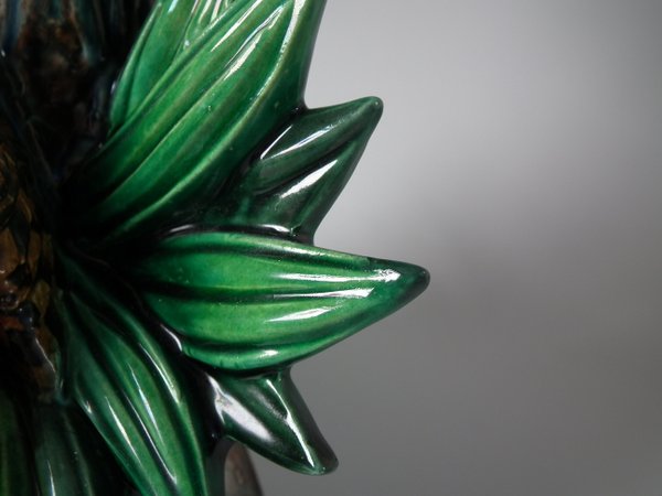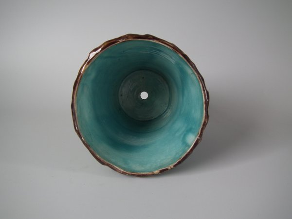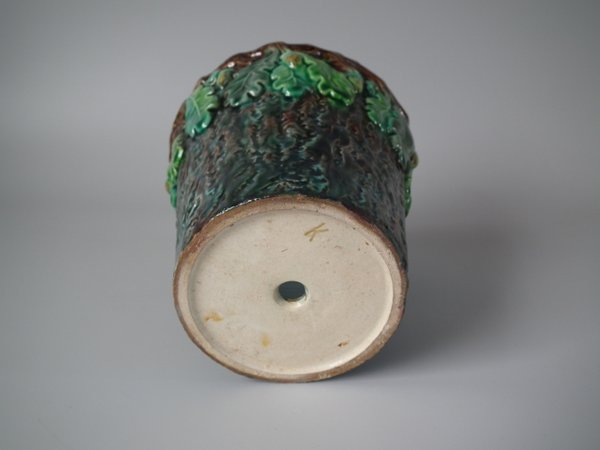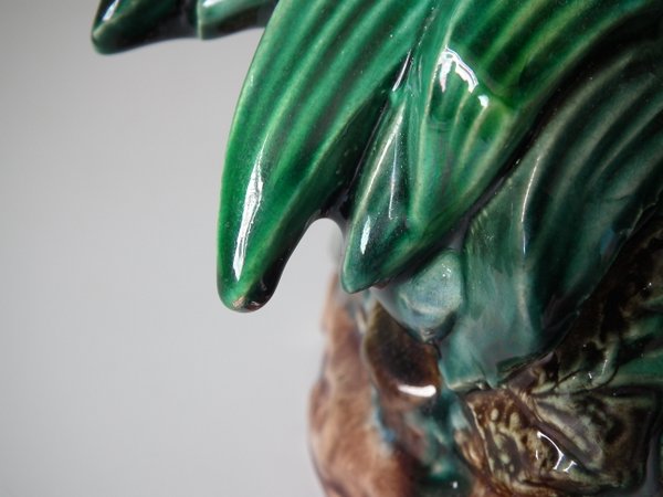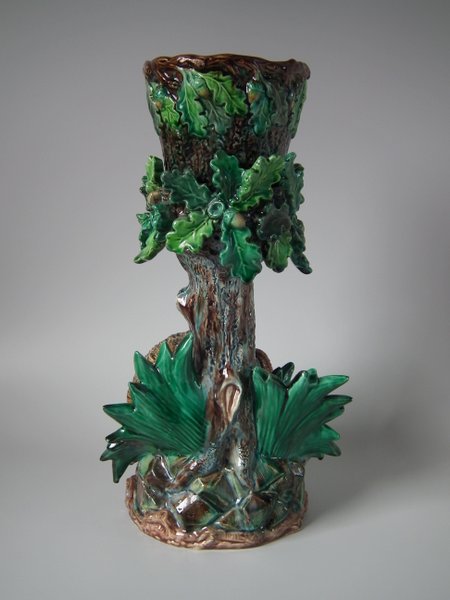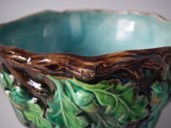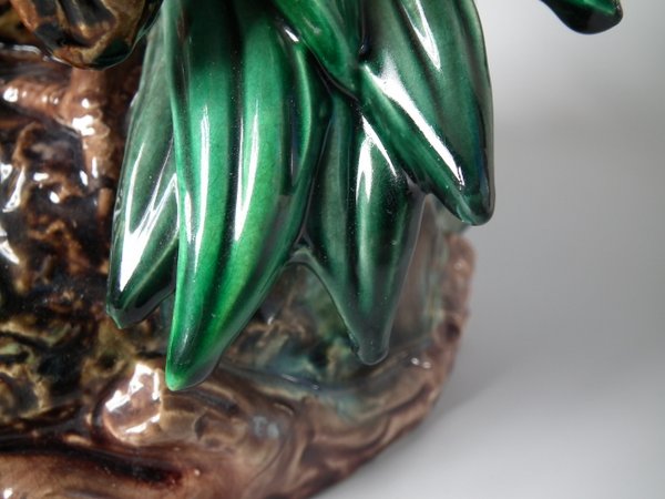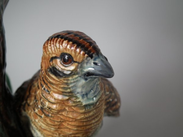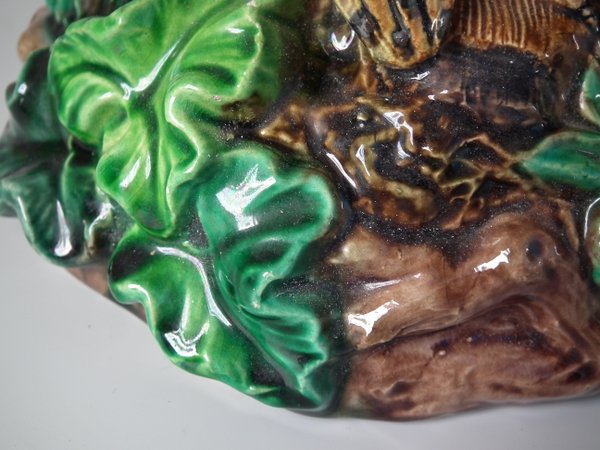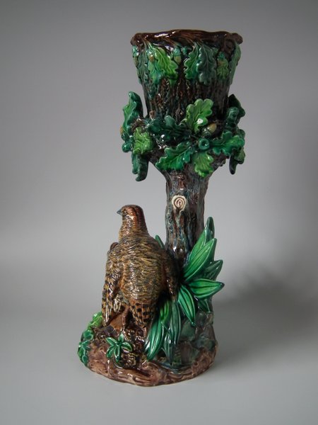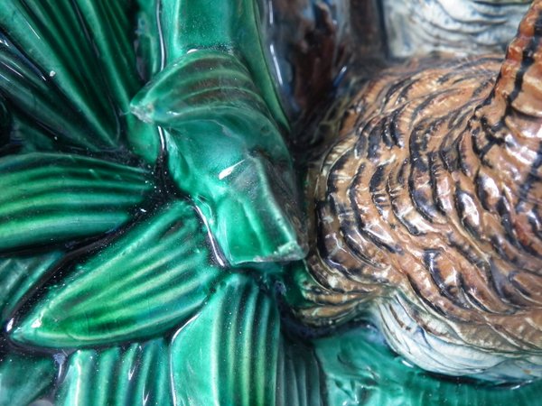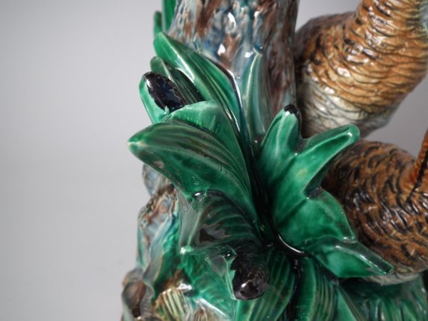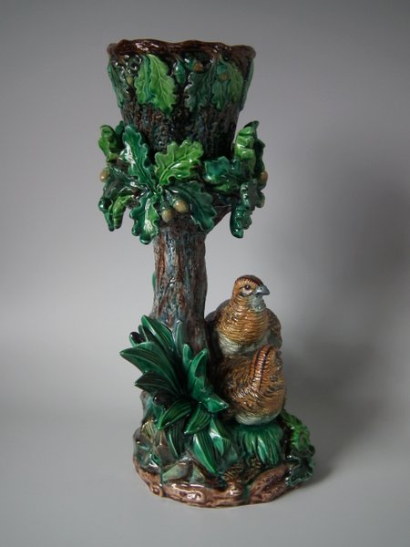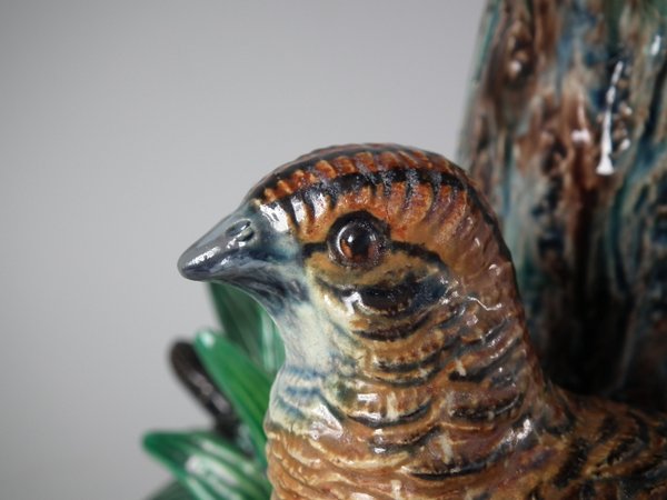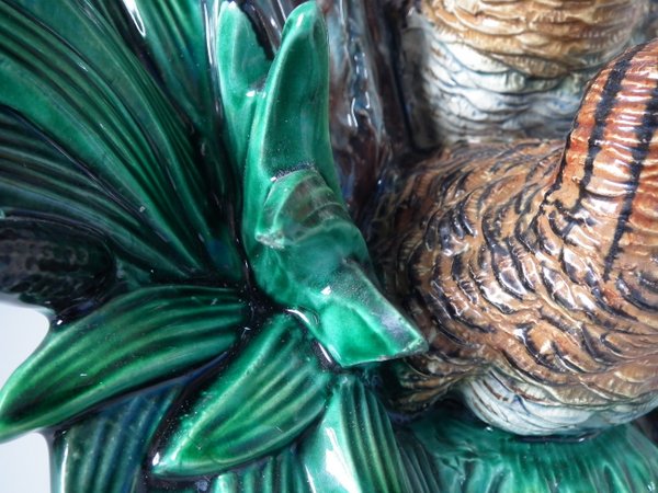 Lonitz Majolica cache pot and stand which features partridges in front of reeds and an oak tree.