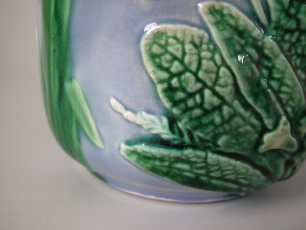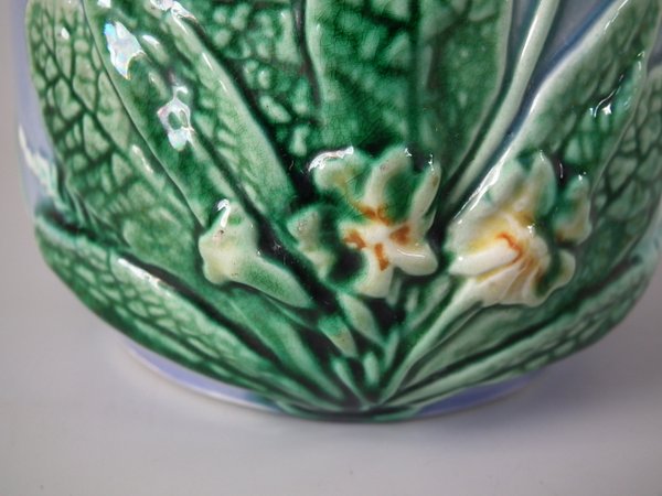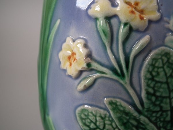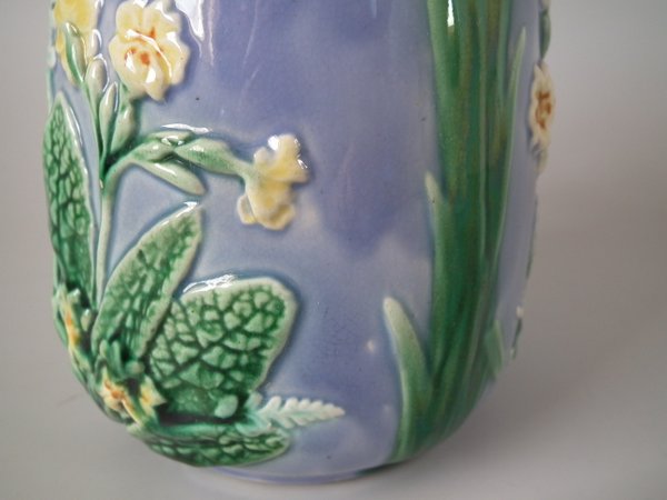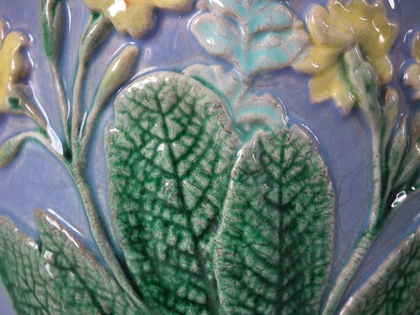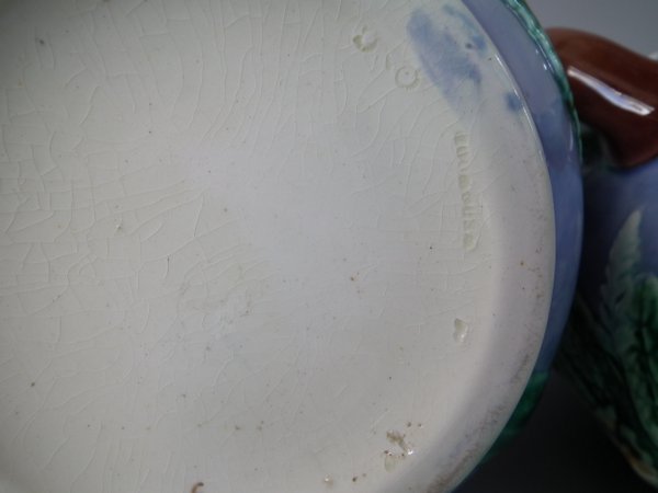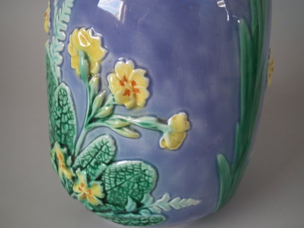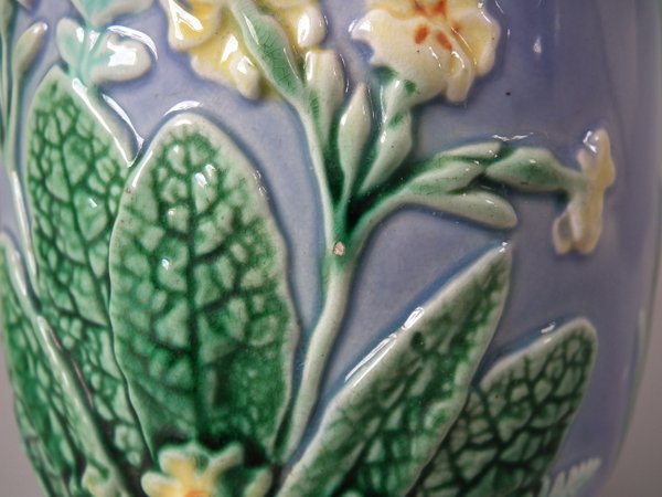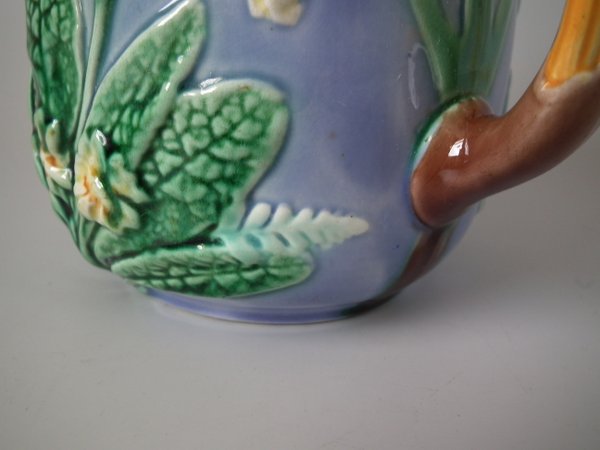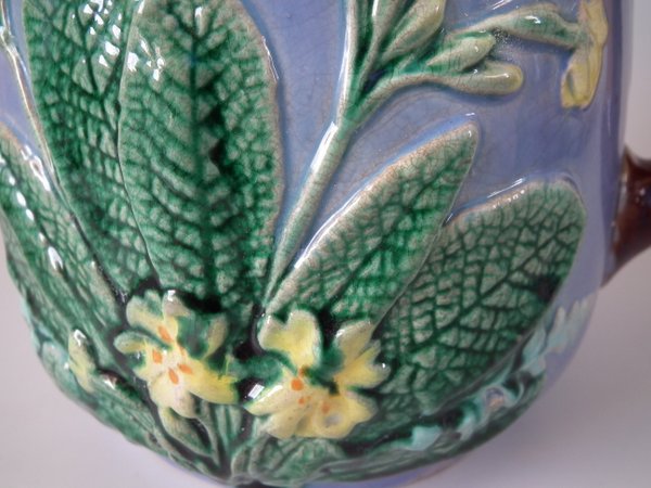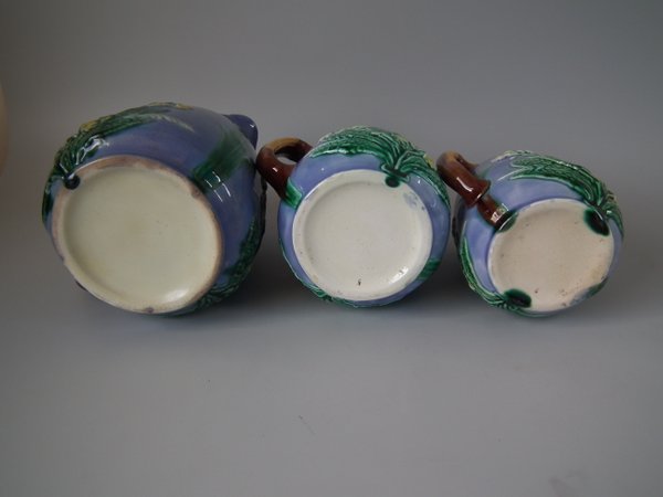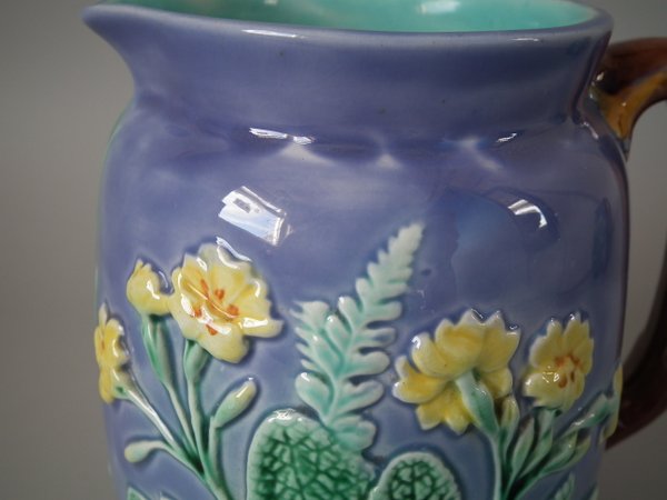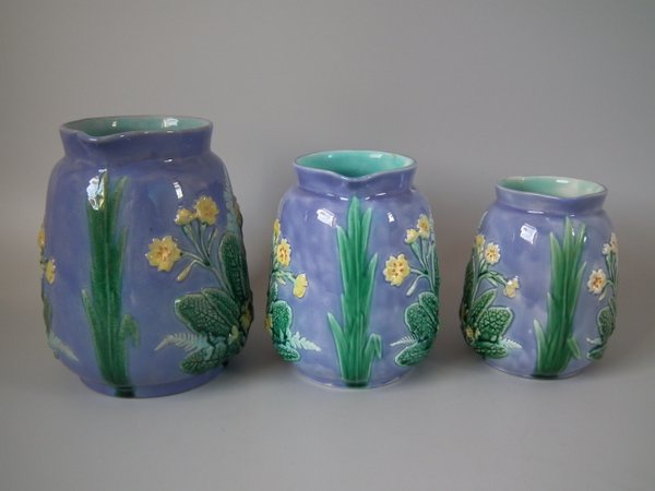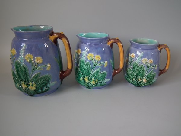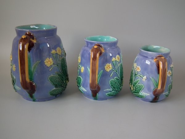 Victorian, circa 1874. Tallest is 7.5ins high, 7.5ins wide, 4.7ins depth. Set of three Wedgwood Majolica jug/pitchers which feature primroses. Lilac ground version.