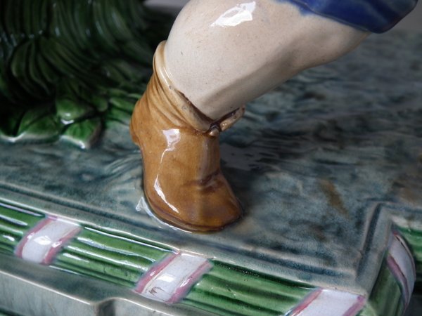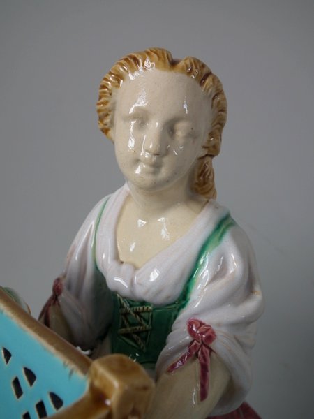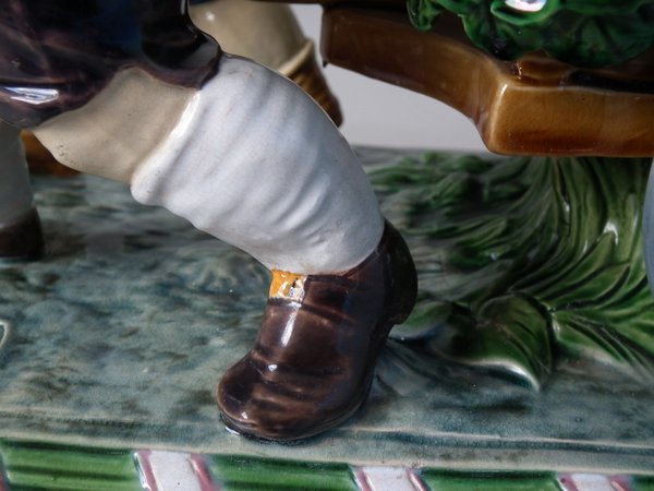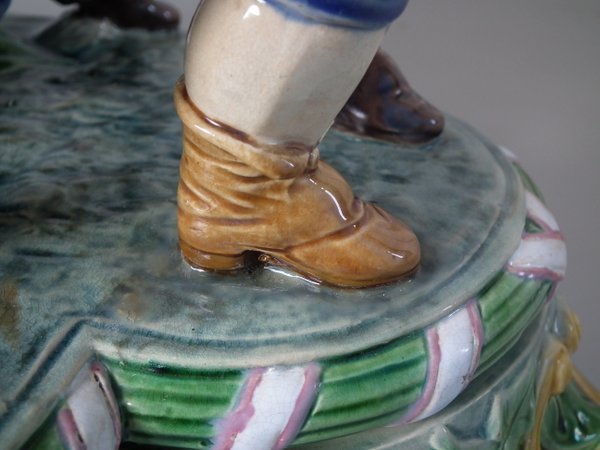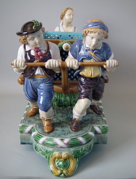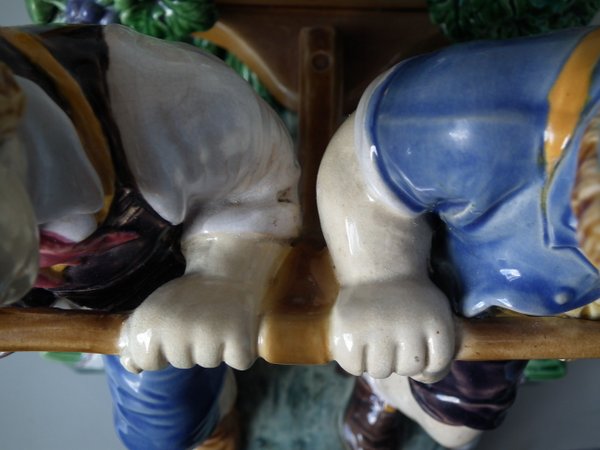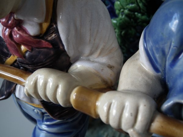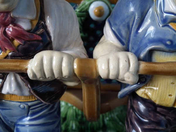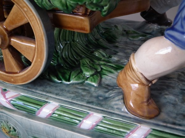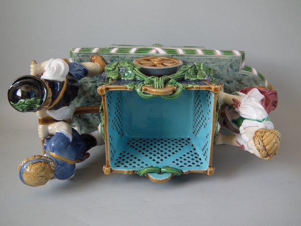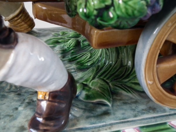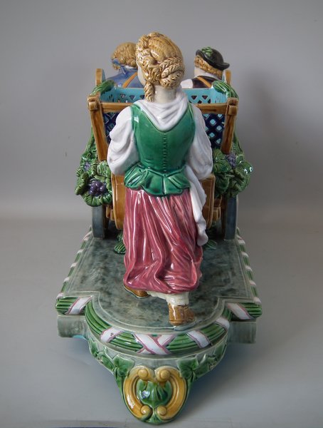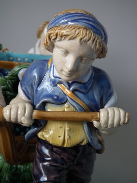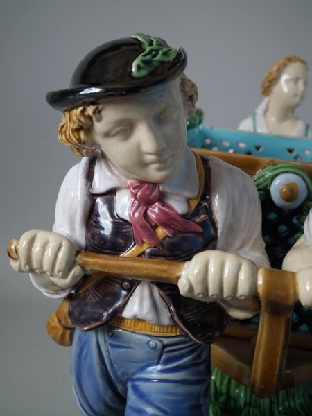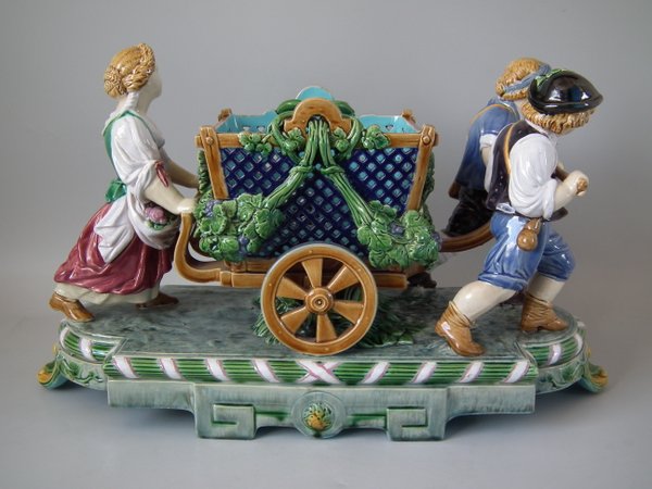 Mintons Majolica centrepiece which features two male vintagers pulling a chariot/cart with a female vintager pushing the chariot from behind.