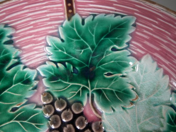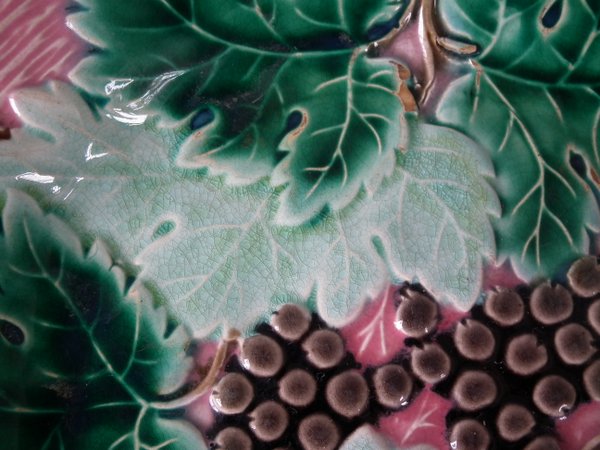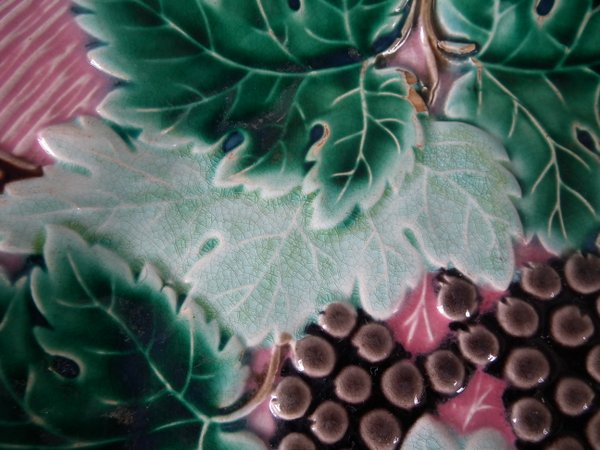 Circa 1880. 8.9ins high, 8.9ins wide, 1ins depth. Boch Freres Kermis Majolica plate which features grapes and vines.