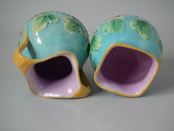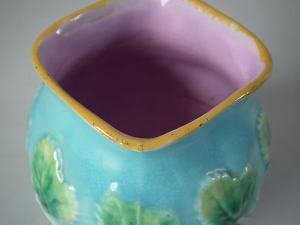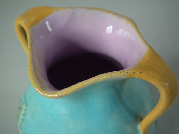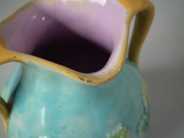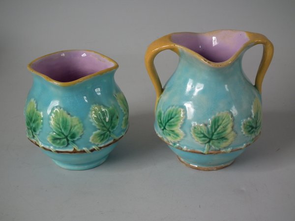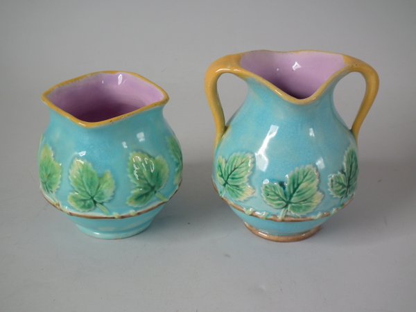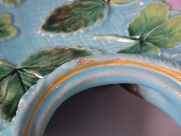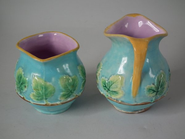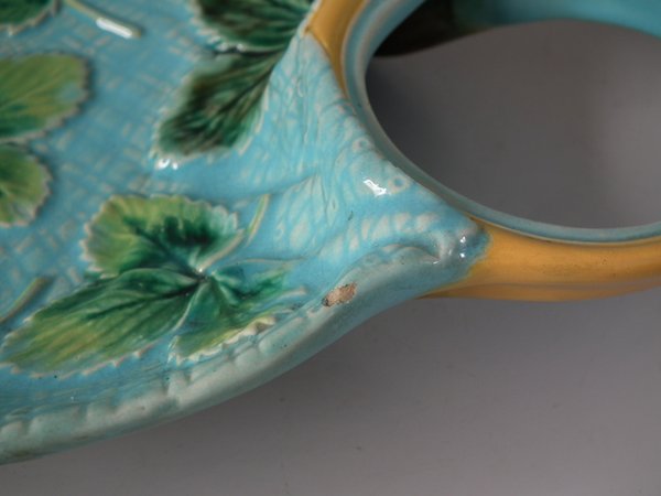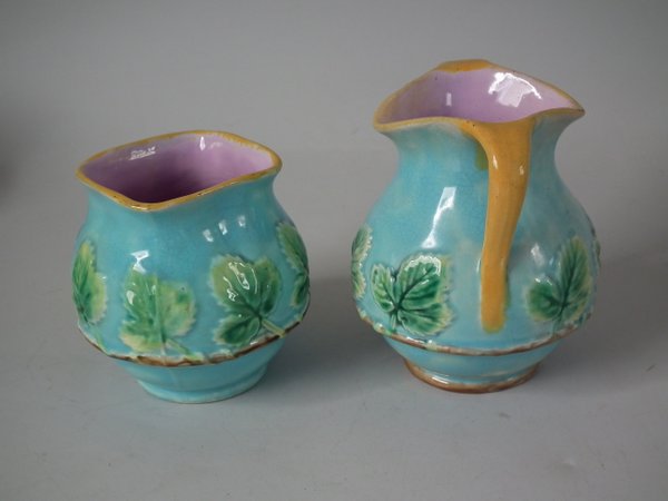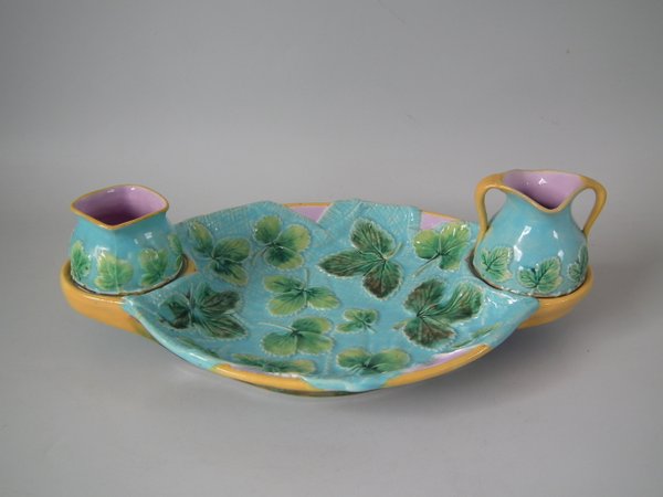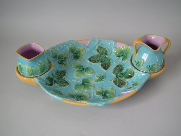Victorian, circa 1870. 4.5ins high, 14.3ins wide, 9.2ins depth. George Jones Majolica strawberry server, creamer & sugar