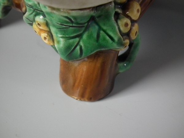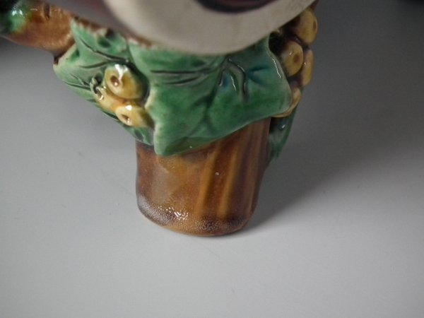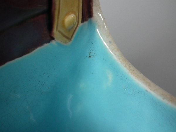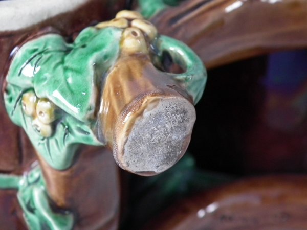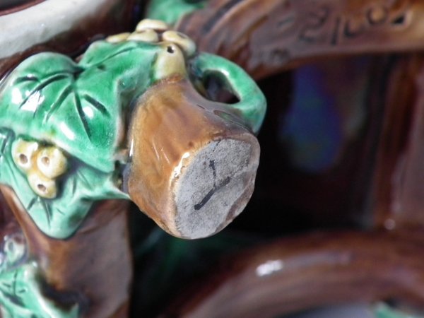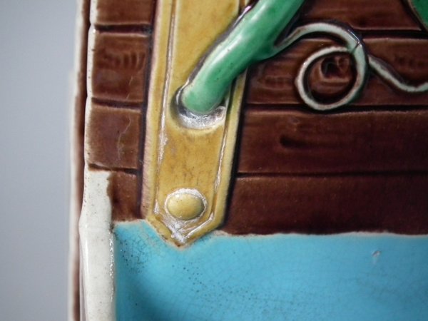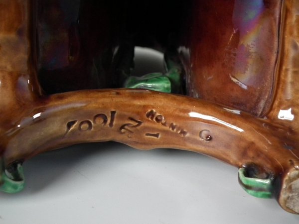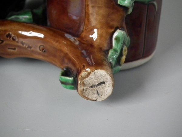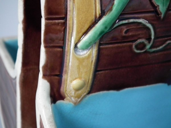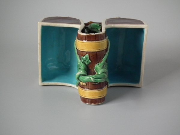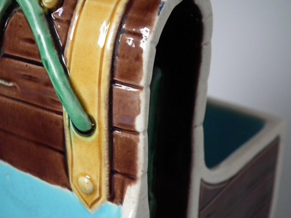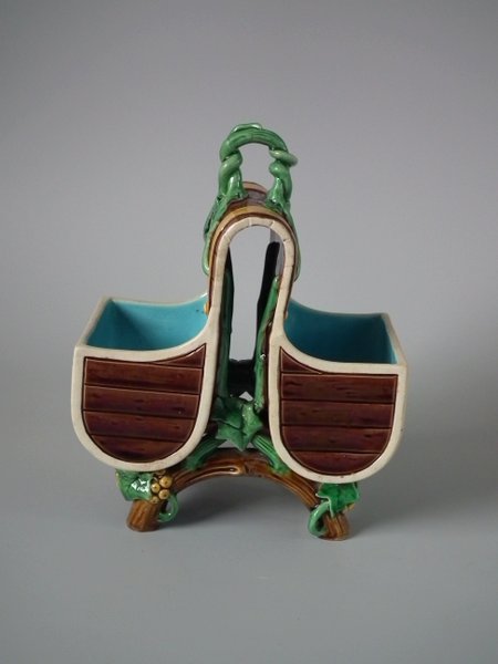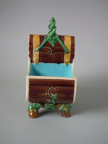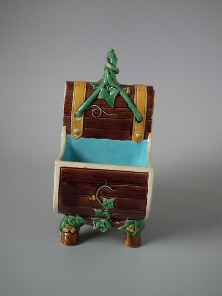Victorian, circa 1871. 7.9ins high, 6.1ins wide, 3.7ins depth. Minton Majolica basket which features wood panelled troughs and an ivy handle.