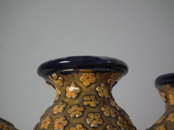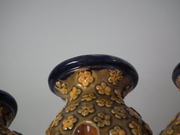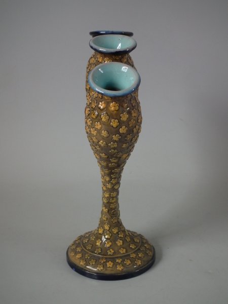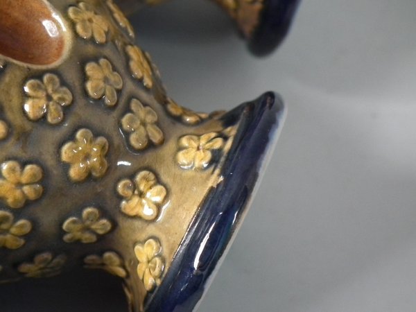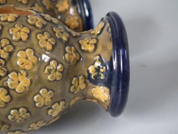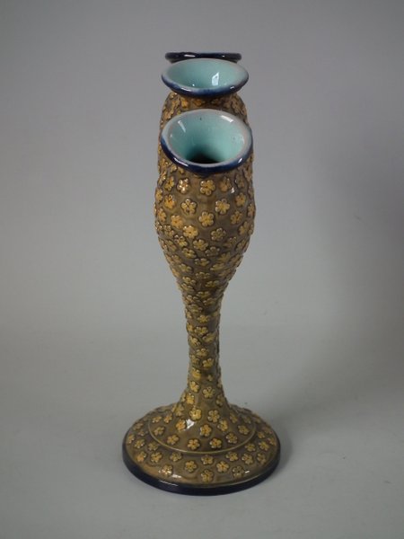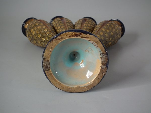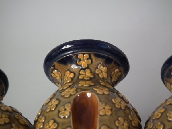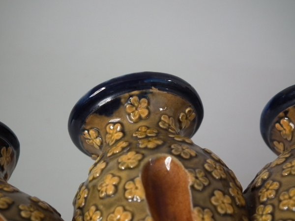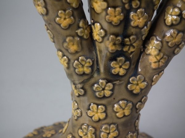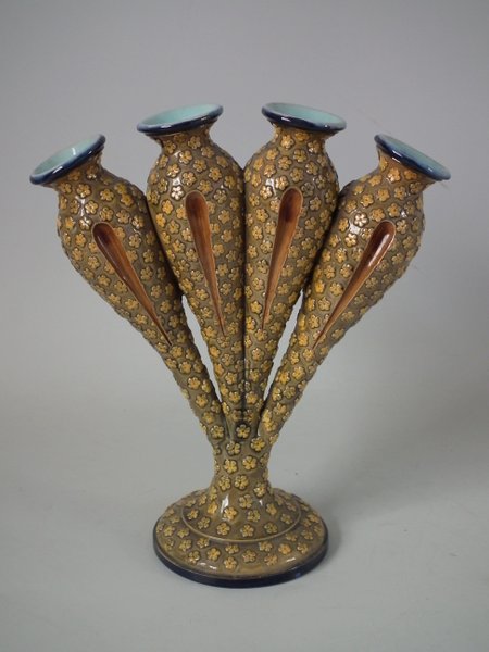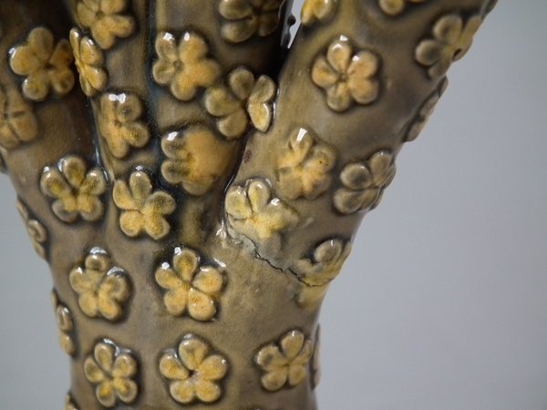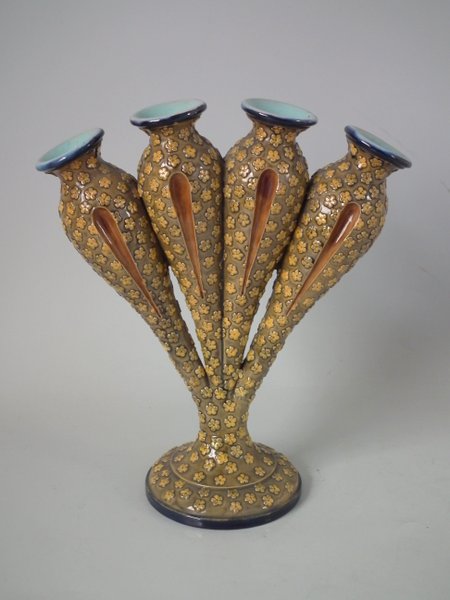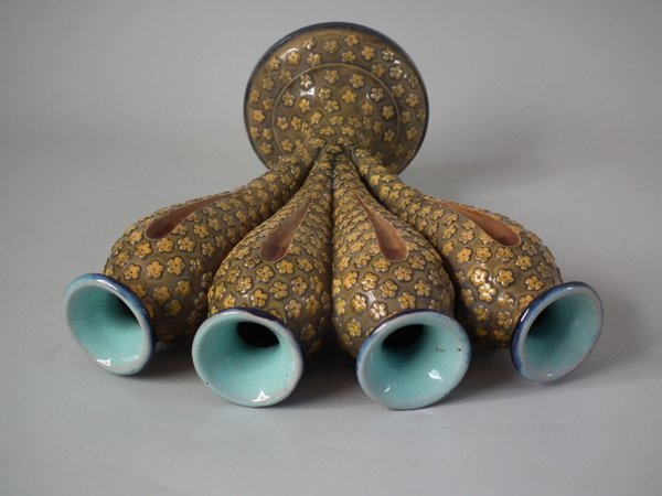 Circa 1890. 9.4ins high, 8.3ins wide, 3.9ins depth. Majolica vase which features four trumpet shaped vases with floral pattern to the exterior.