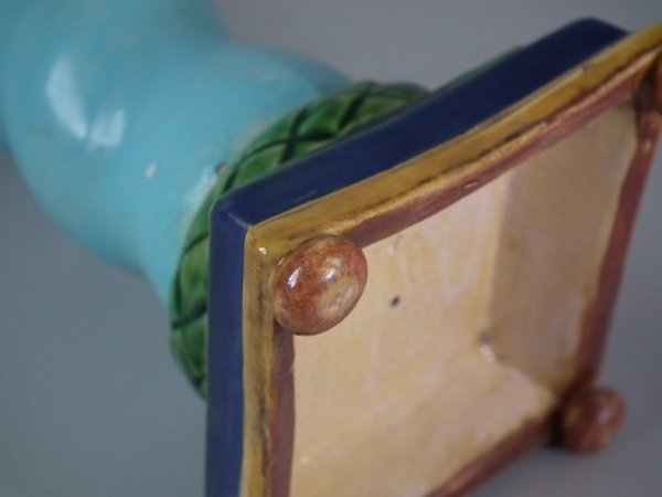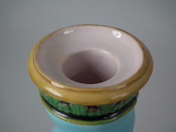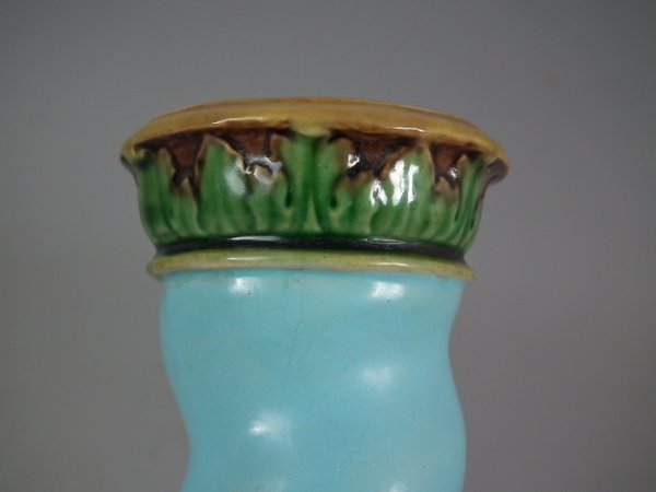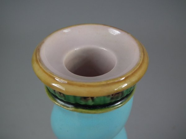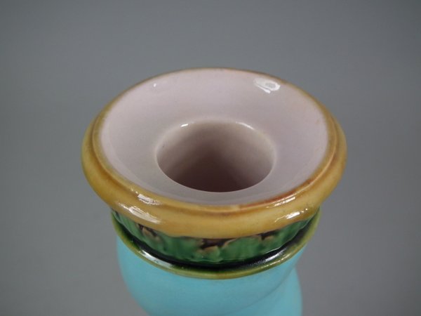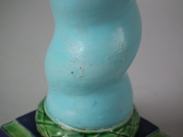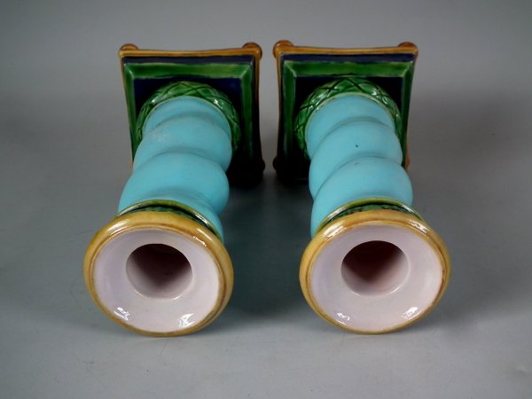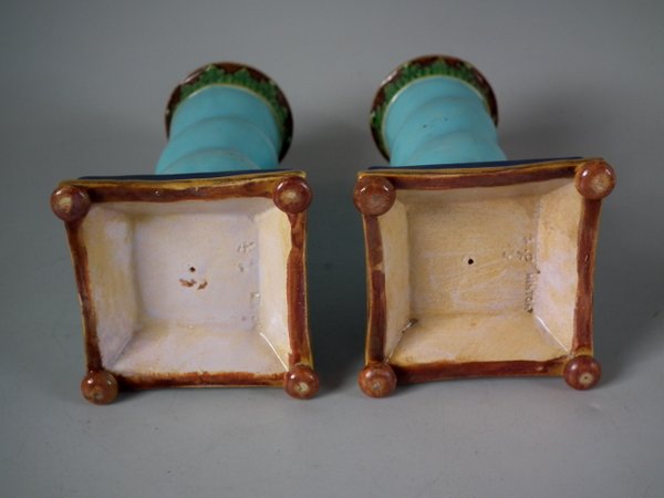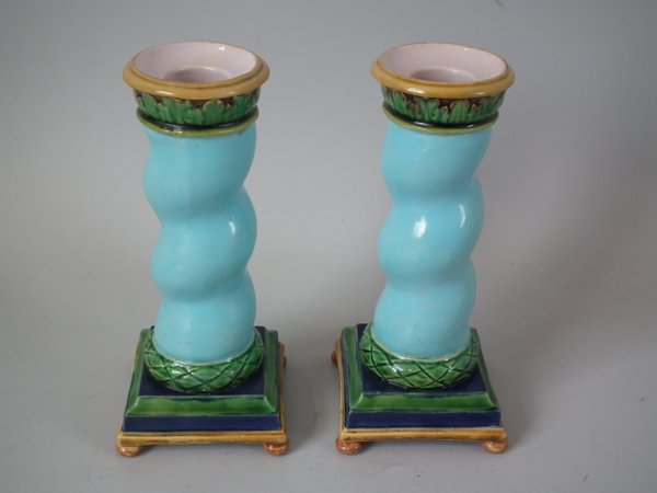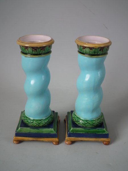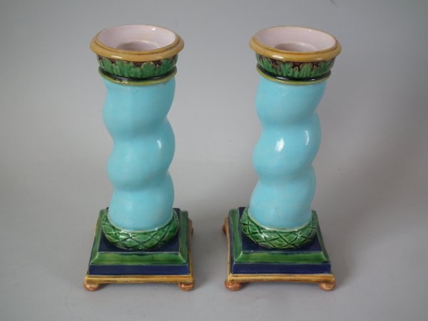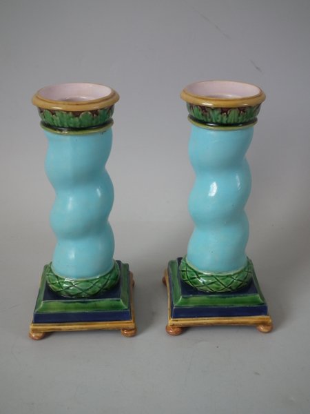 Victorian, circa 1862. Tallest is 6.1ins high, 3ins wide, 3ins depth. Pair of Minton Majolica candlestick holders which feature twisted columns,