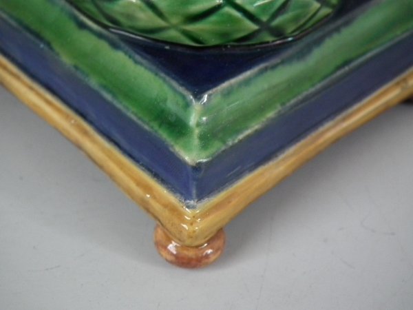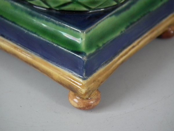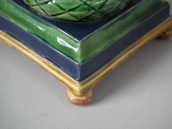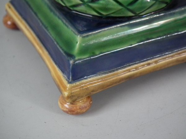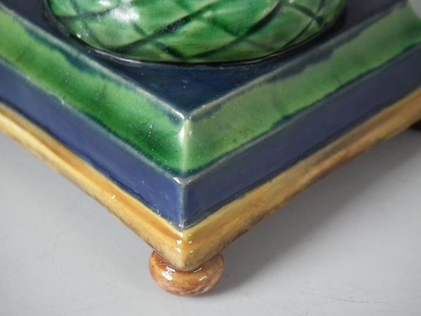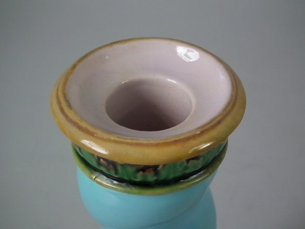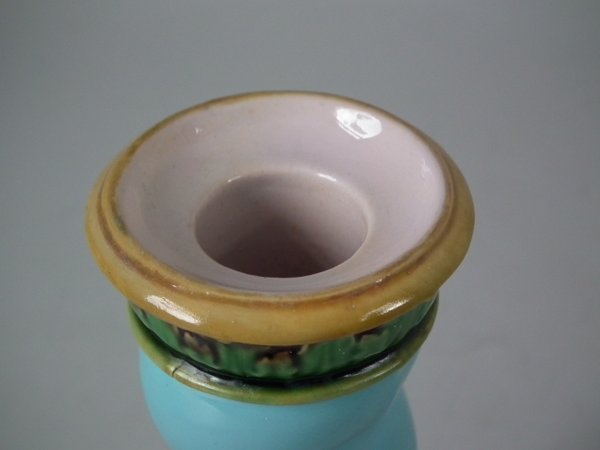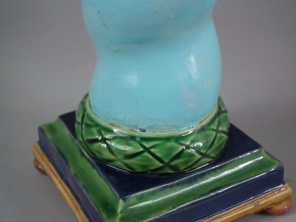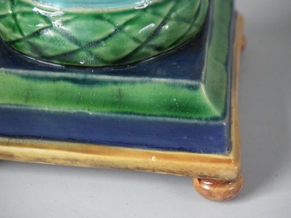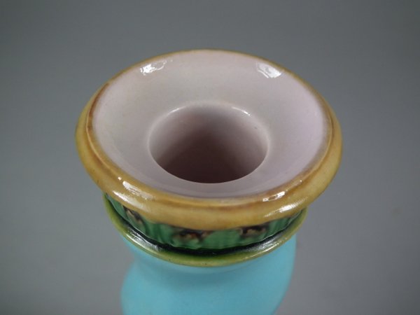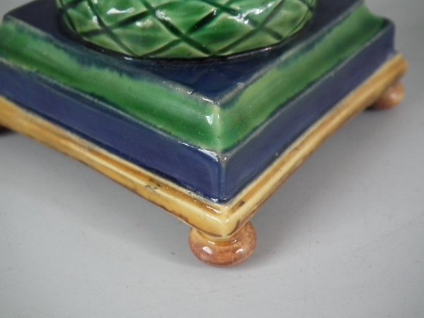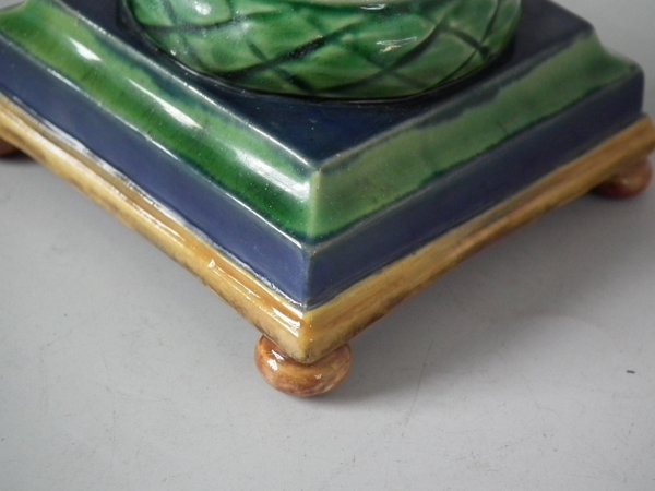 Victorian, circa 1862. Tallest is 6.1ins high, 3ins wide, 3ins depth. Pair of Minton Majolica candlestick holders which feature twisted columns,