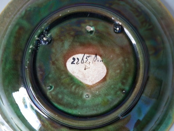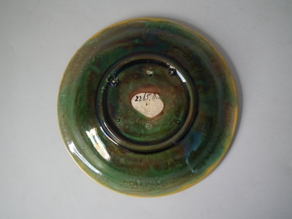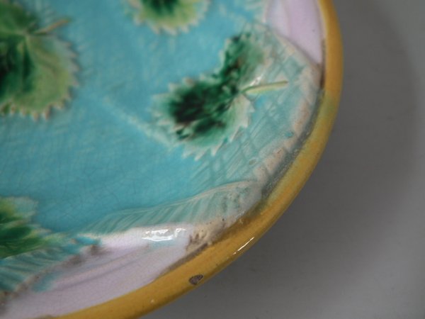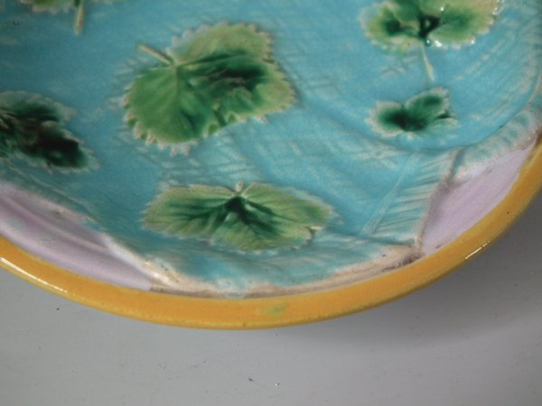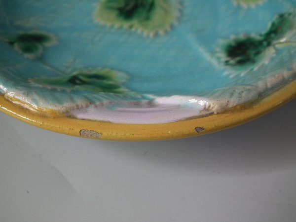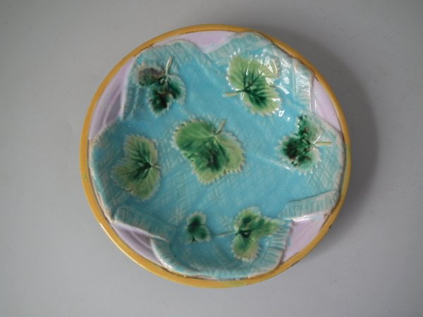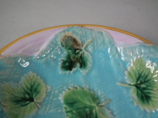 Victorian, circa 1870. 5.5ins high, 5.5ins wide, 1ins depth. George Jones Majolica dish which features strawberry leaves on napkins.