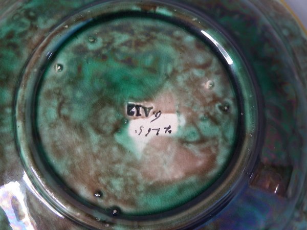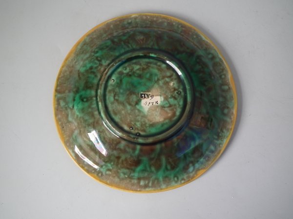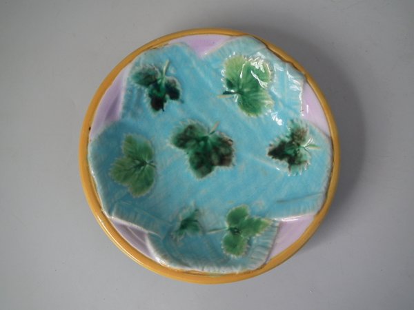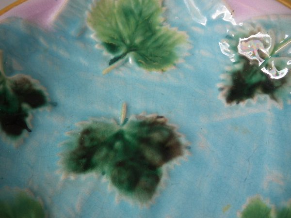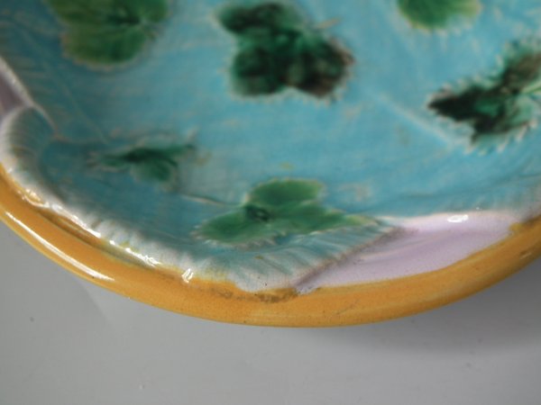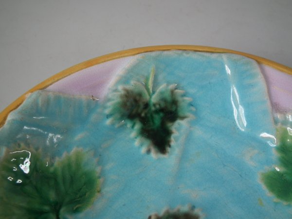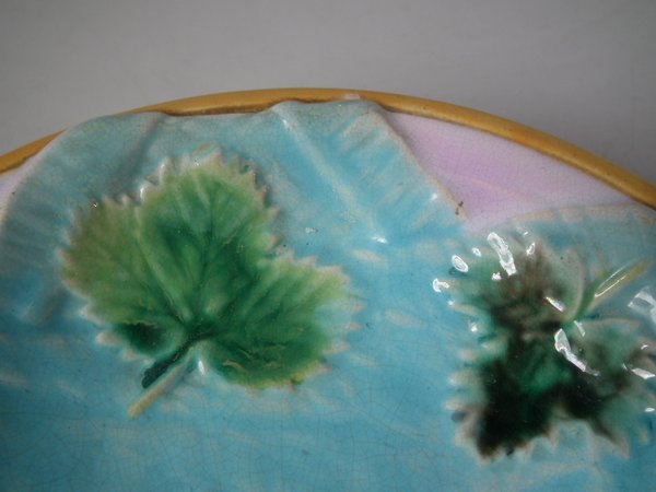 Victorian, circa 1870. 5.5ins high, 5.5ins wide, 1ins depth. George Jones Majolica dish which features strawberry leaves on napkins.