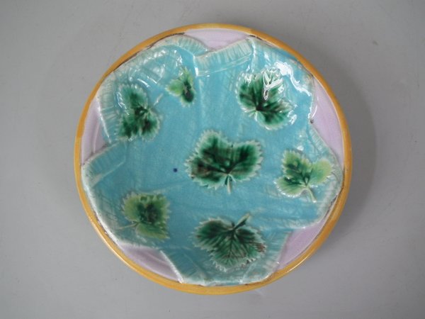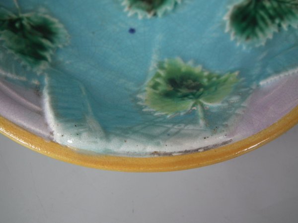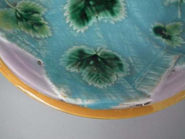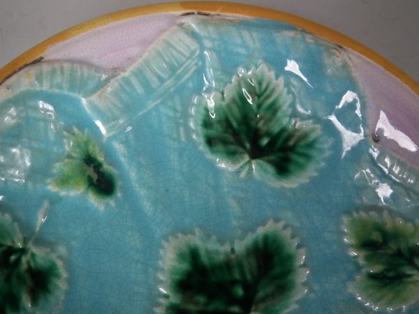 Victorian, circa 1870. 5.5ins high, 5.5ins wide, 1ins depth. George Jones Majolica dish which features strawberry leaves on napkins.