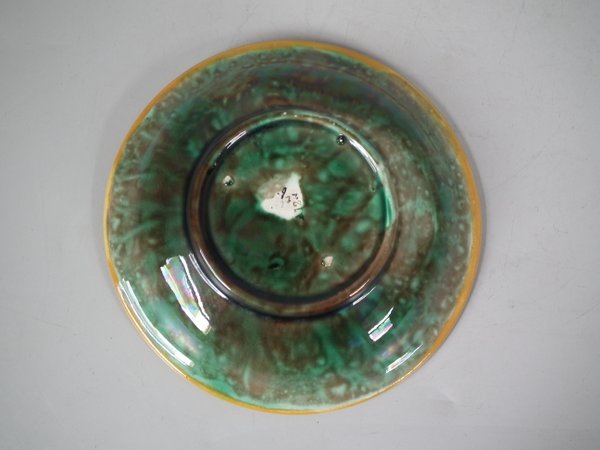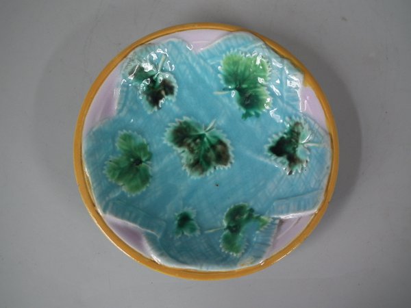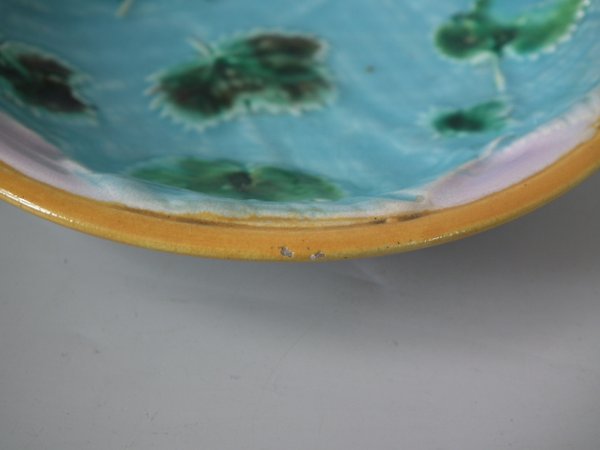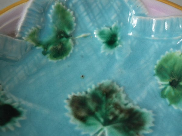 Victorian, circa 1870. 5.5ins high, 5.5ins wide, 1ins depth. George Jones Majolica dish which features strawberry leaves on napkins.