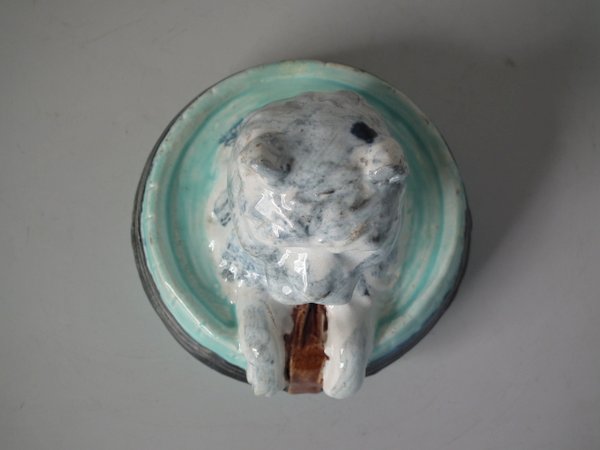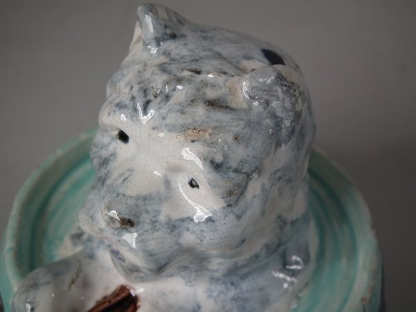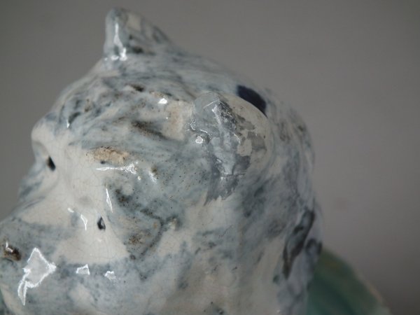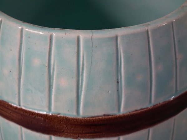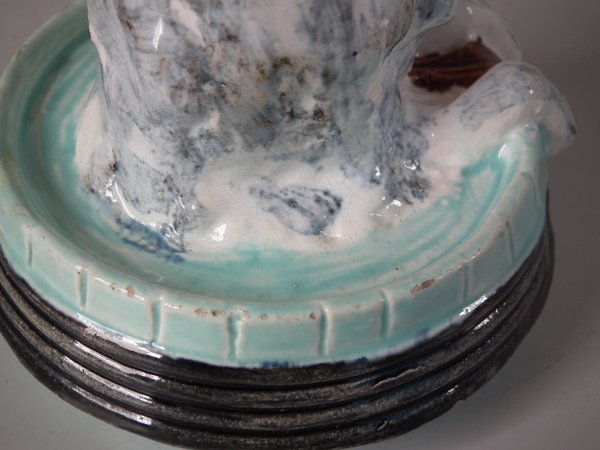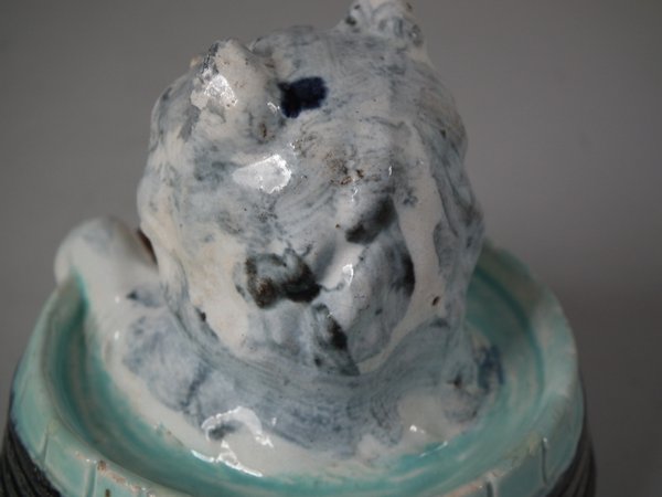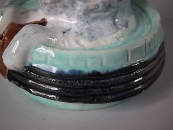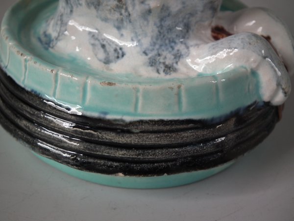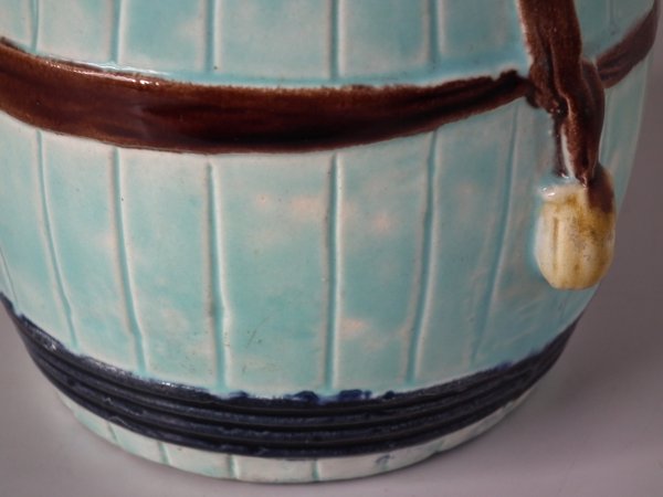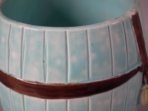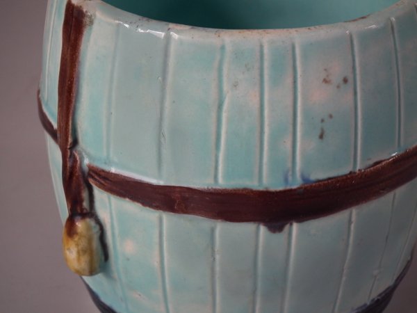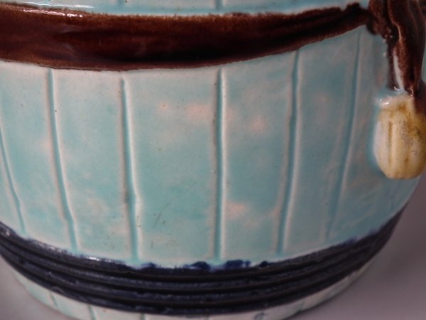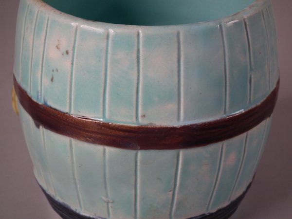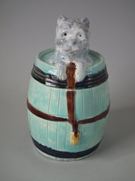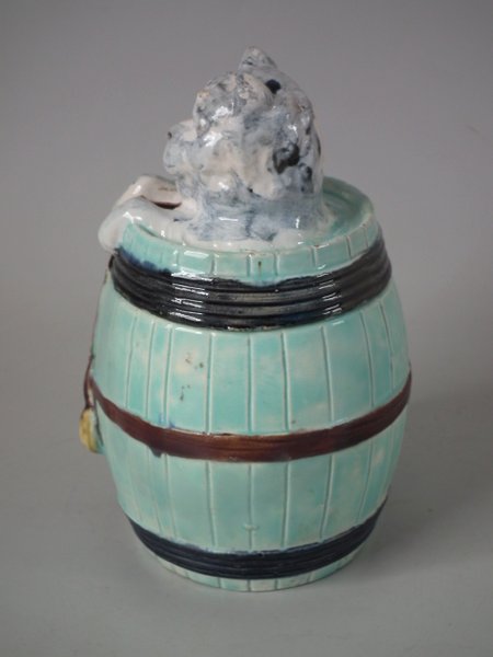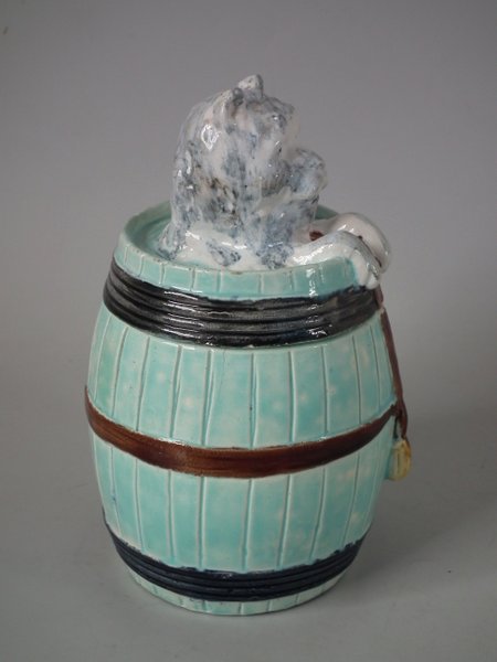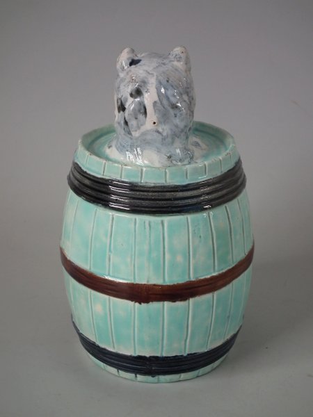 Victorian, circa 1880. 7.1ins high, 4.3ins wide, 4.3ins depth. Majolica tobacco jar and cover which features a dog in a barrel.